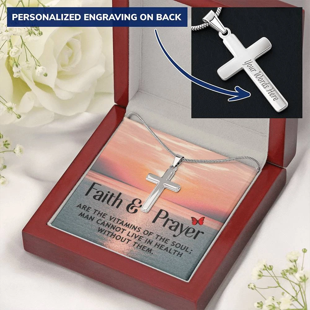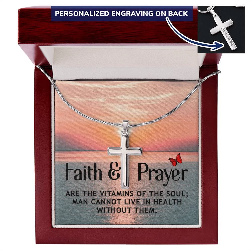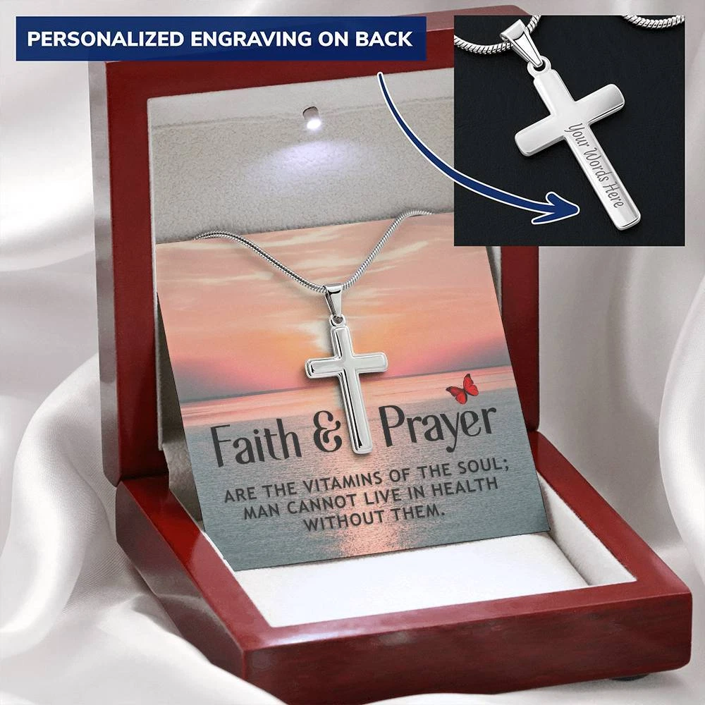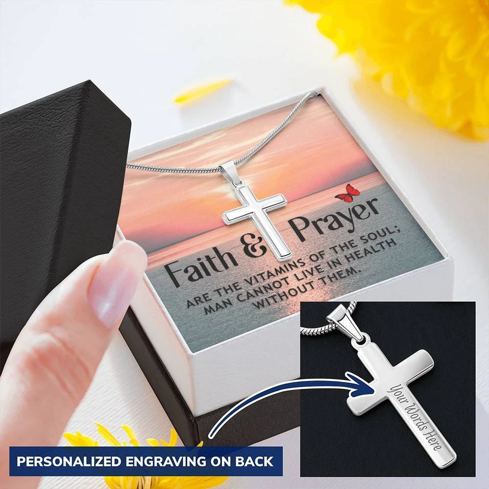 Wear your faith proudly with this Personalized Cross Necklace . Perfect for special occasions or everyday wear, our Personalized Cross Necklace is a wonderful gift idea for you or your loved one. The gorgeous pendant can be further personalized on the back with a name, date, or short message, up to 20 characters. This is a gift that will surely be treasured for years to come! Sizing is appropriate for all ages, and tasteful for both men and women. Crafted in high polished stainless steel, this piece will resist tarnishing and is hypoallergenic for sensitive skin. Includes a luxury adjustable snake chain (18" - 22") and attaches with an easy to use lobster clasp. Cross Necklace Details • Polished stainless steel • Pendant height: 1.3" (33.5mm) • Pendant width: 0.8" (19mm) • Adjustable snake chain (18" - 22") • Lobster clasp closure