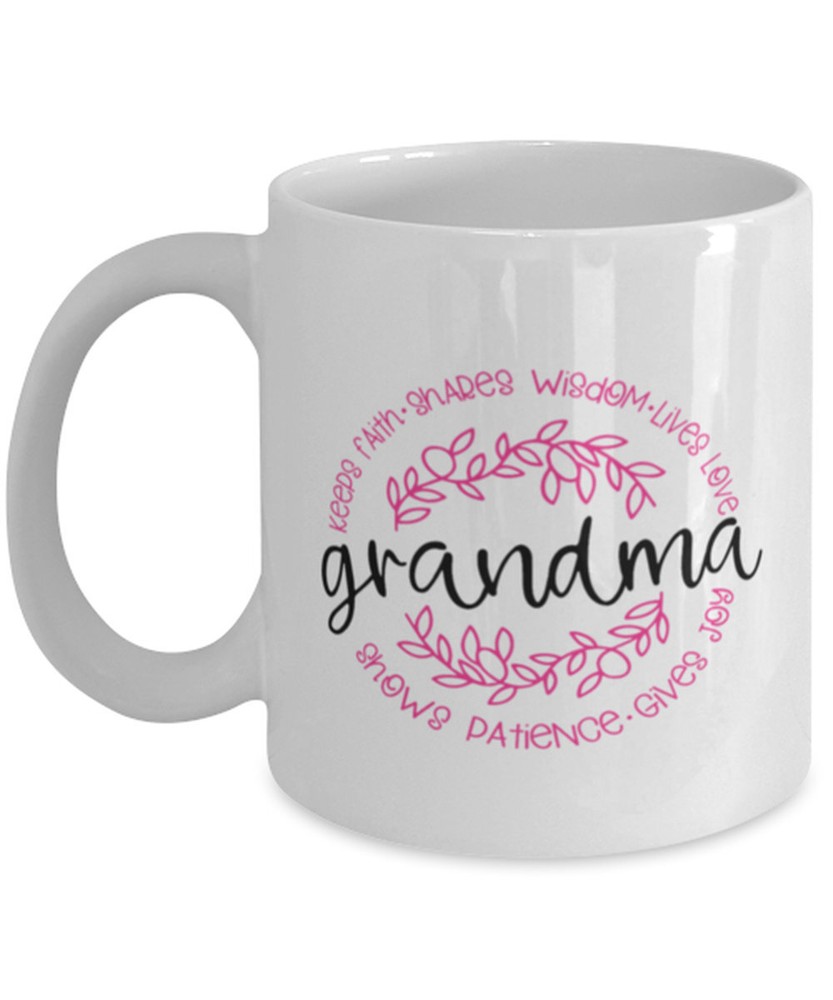 Grandma Coffee Mug Keeps Faith Shares Wisdom Lives Loves Shows Patience Gives Product Details.. This high quality 11oz. ceramic white mug has a premium hard coat that provides crisp and vibrant color reproduction sure to last for years. Perfect for all hot & cold beverages. The highest quality printing possible is used. It will never fade no matter how many times you wash it. Material: 100% Ceramic. Print both sides. Dishwasher and Microwave Safe. High Gloss + Premium White Finish. Printed in the U.S.A. Personalized & Custom. We support personalized and custom mug to add custom, when placing an order, you can add notes to the "order note" in shipping address section. Also you can contact us directly via message. Shipping Info. Ready to ship in 1 to 2 business days, All products are made-to-order and proudly printed in the United States. Shipped by USPS and DHL, You will receive your order in 5-7 days. Replace & Refund. All products are defective during shipping broken, chipped will be replaced free of charge. You are not satisfied with the product, we will refund 100% money to you. If any other issues arise, please do not hesitate to message, we would be more than happy to assist you.