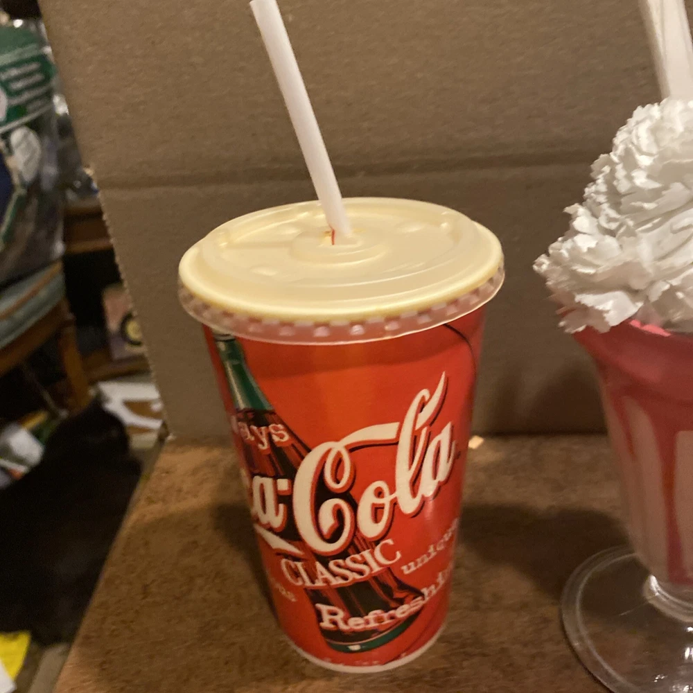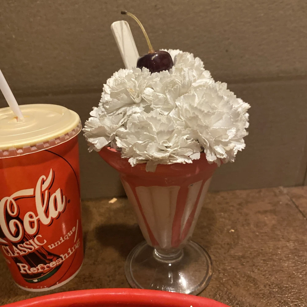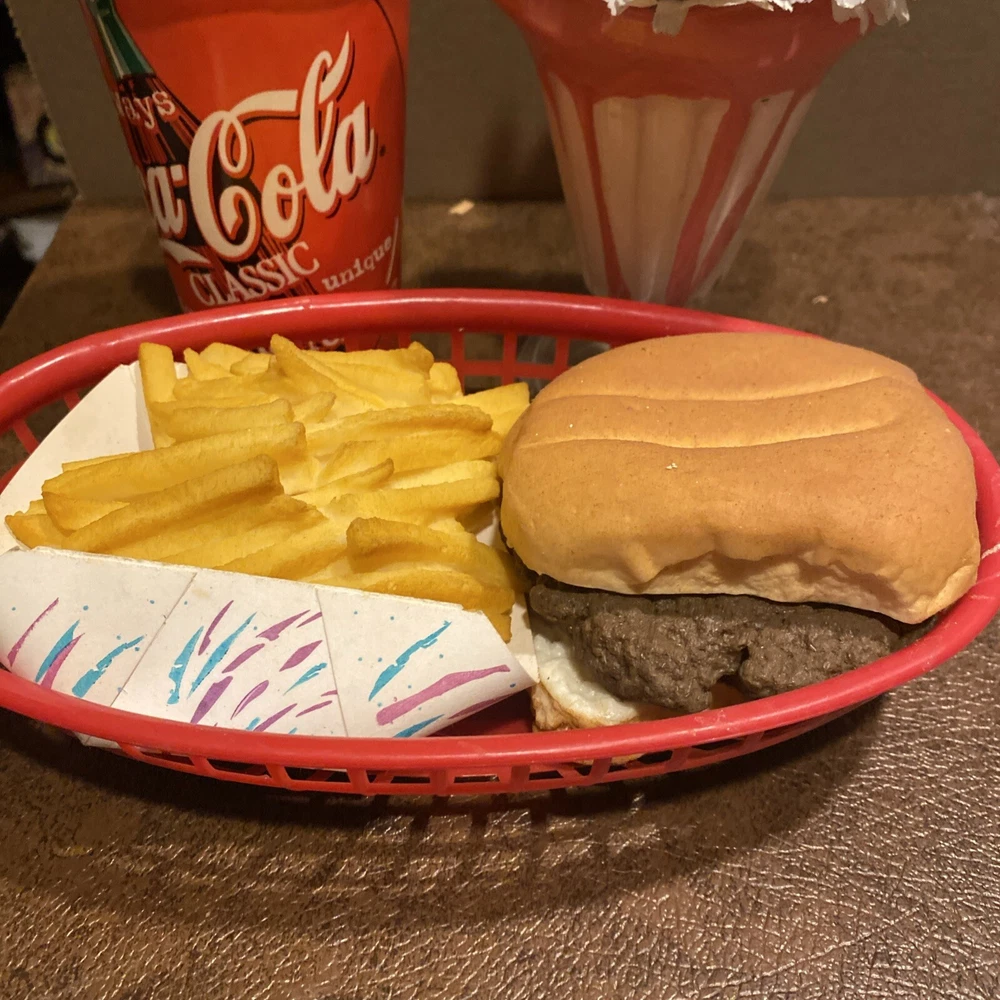 This fake food prop display features a delicious hamburger with French fries and a red basket for easy viewing. It is perfect for restaurants and food service businesses looking to enhance their décor. The display is made by Halco and is a great addition to any collection. The product is a sandwich and the country/region of manufacture is unknown. This item is ideal for those interested in display food and wants to add a unique touch to their collection. see photos/ coke cup is empty