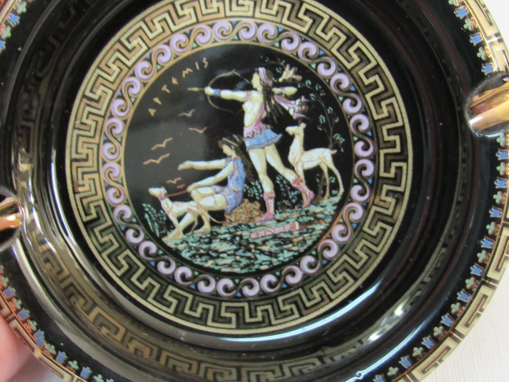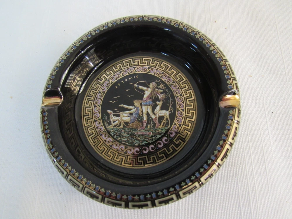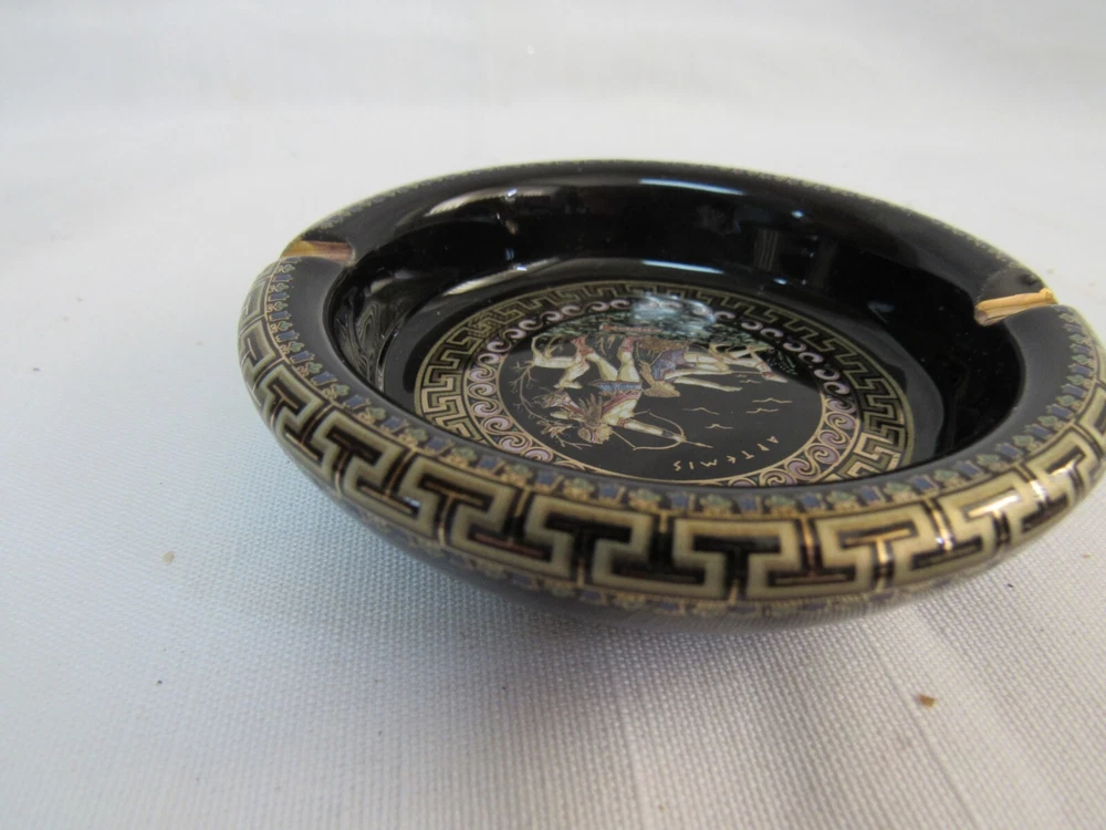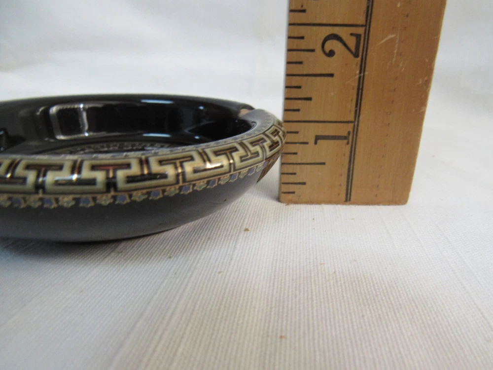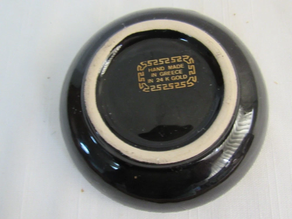 ESTATE LIQUIDATION -------------Fakiolas Ceramics Round Ashtray Handmade In Greece Black With 24k Gold Trim-- no chips, cracks or dings .. see all pics for exact size and condition .........