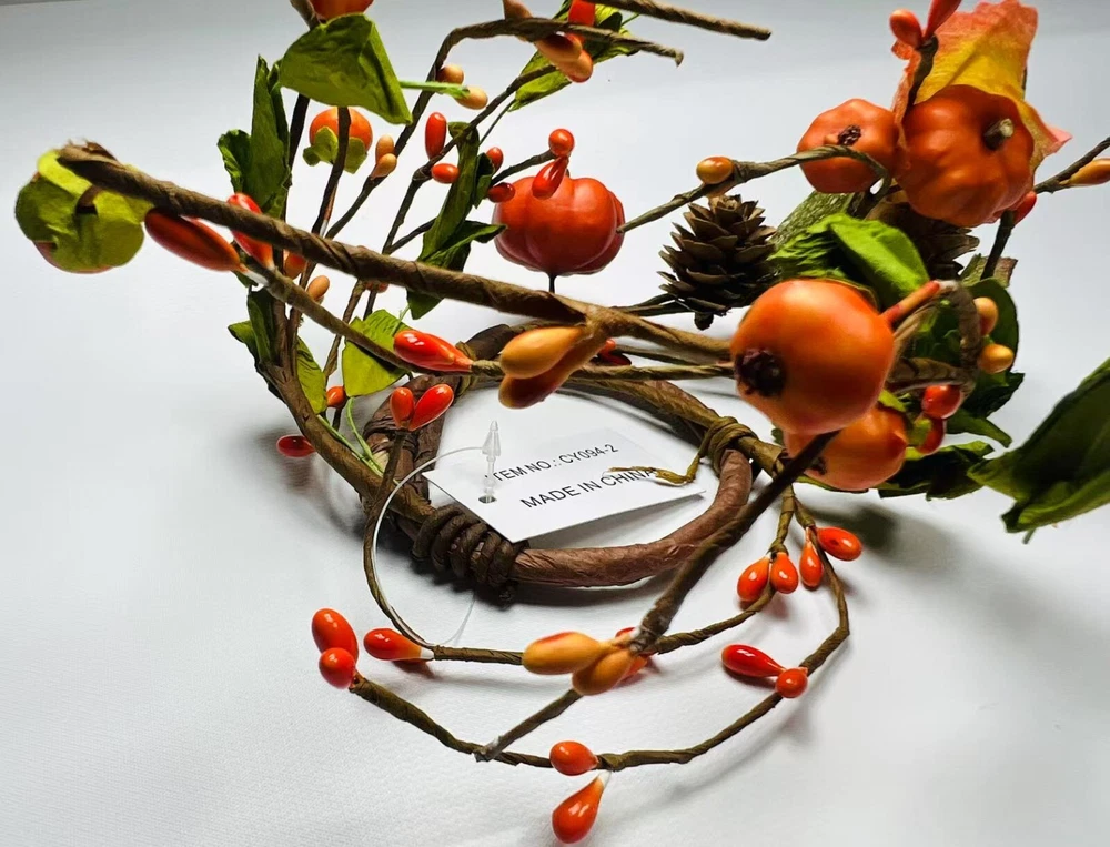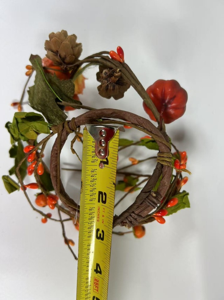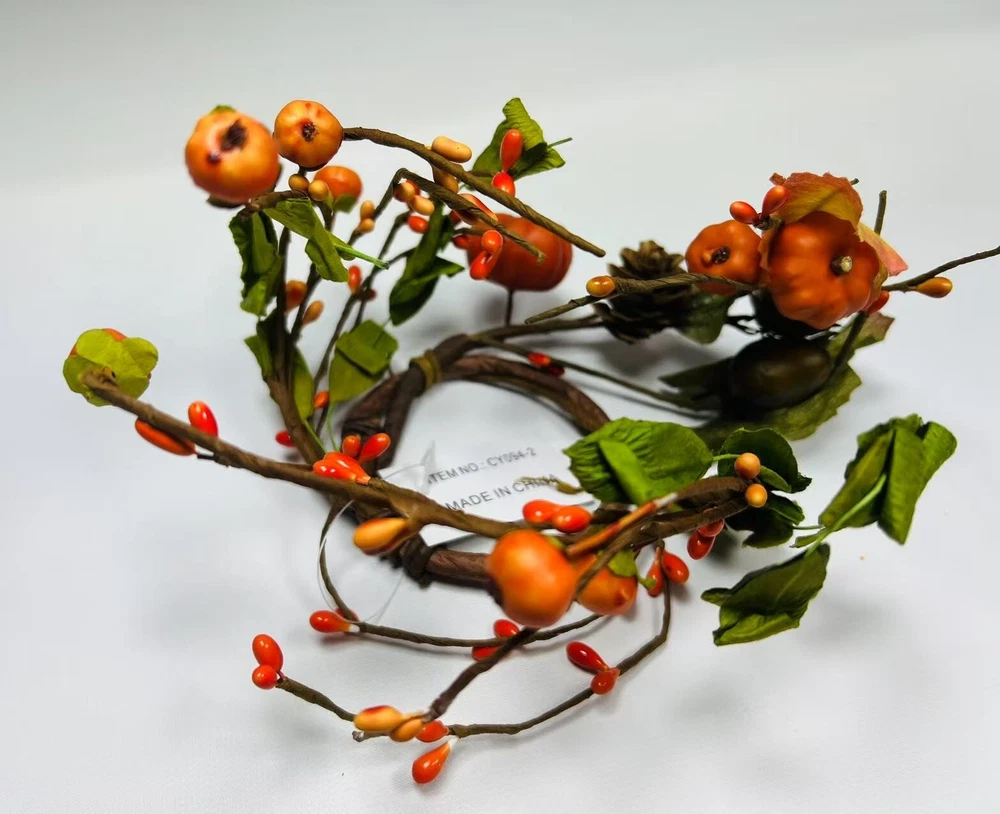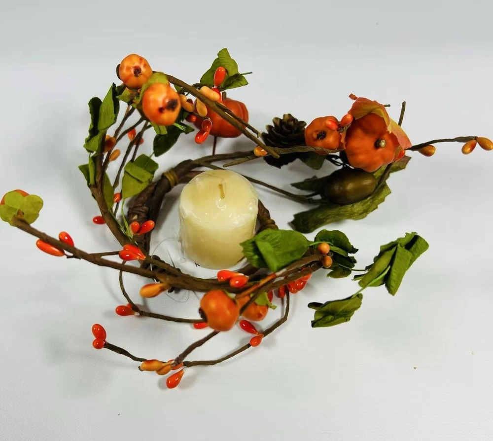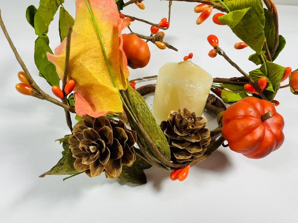 Add a festive touch to your fall decor with this beautiful artificial candle ring featuring lifelike mini pumpkins, berries, pinecones, and colorful fall leaves. Perfectly sized to fit 2.5” candles, it makes a charming centerpiece or accent for mantles, dining tables, and shelves. Crafted with flexible brown-wrapped wire for easy shaping. A great addition to your rustic farmhouse Thanksgiving setup.