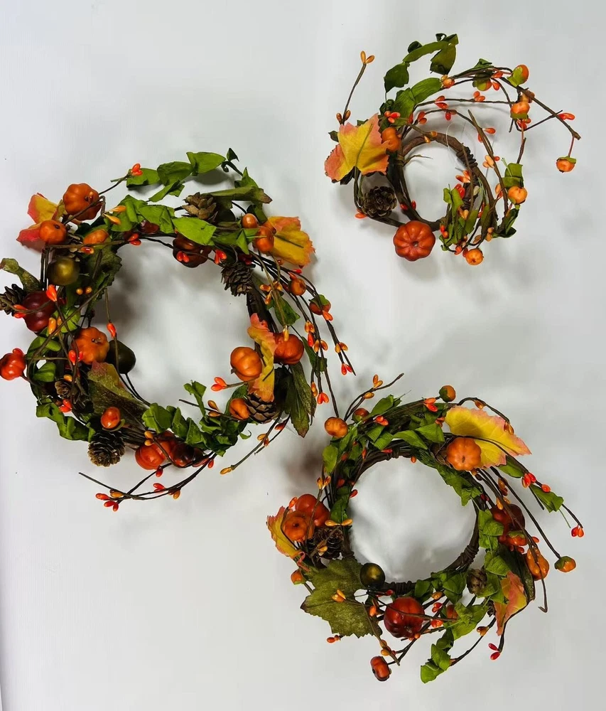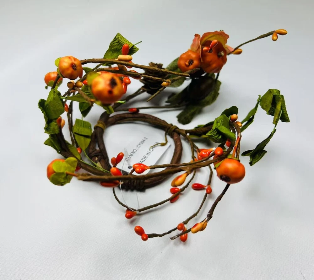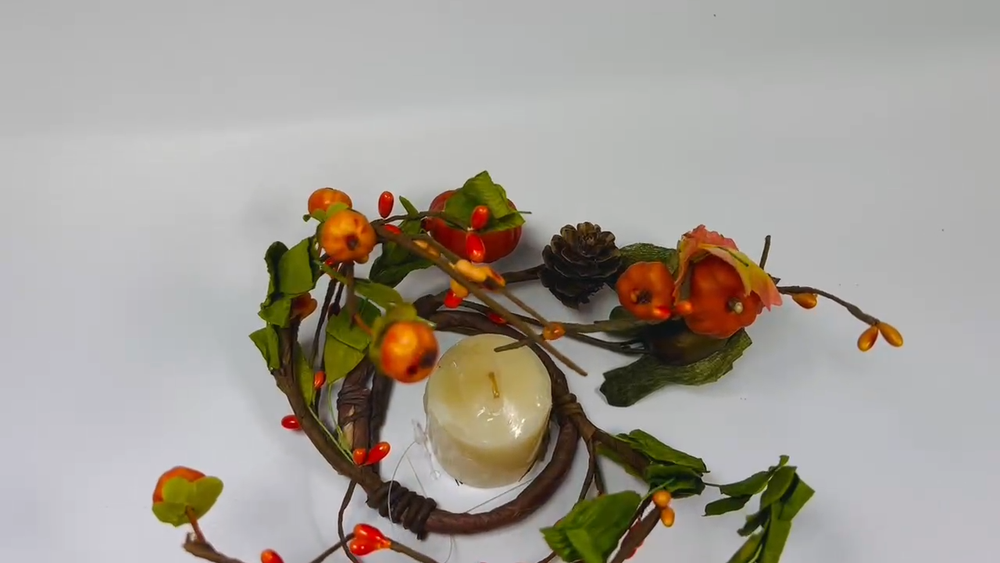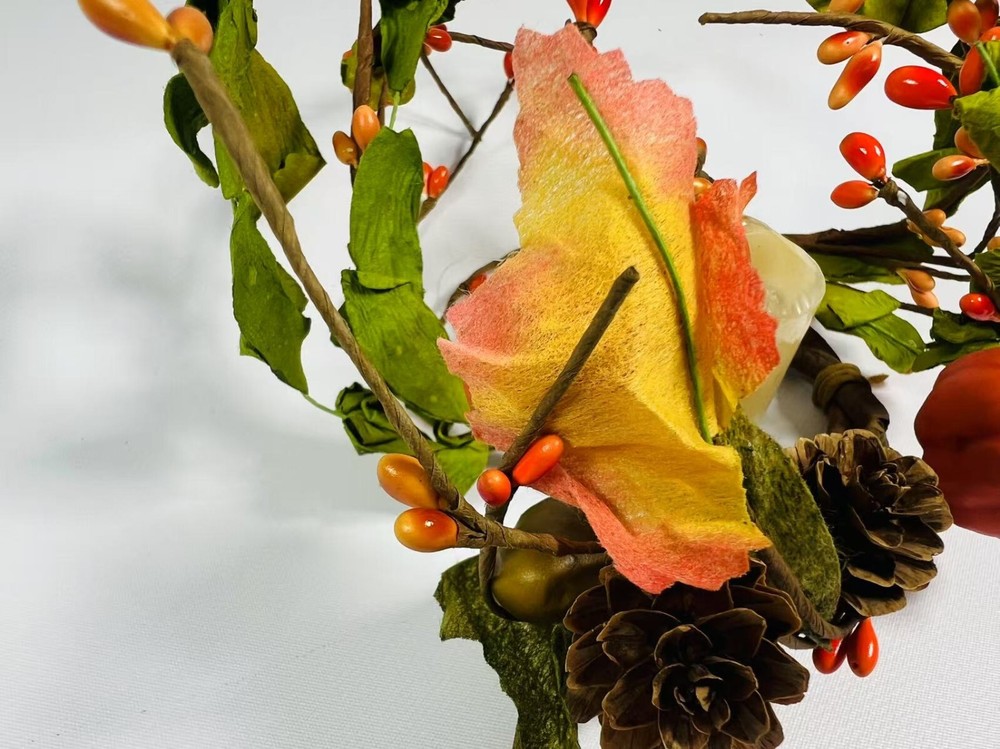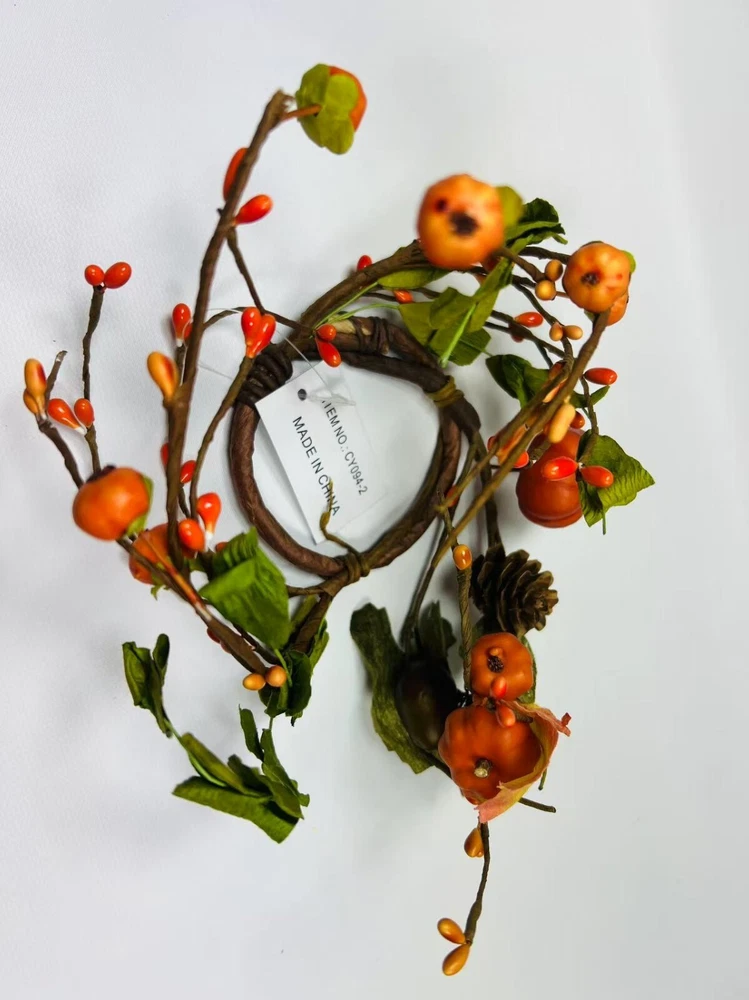 Add a festive touch to your fall decor with this beautiful artificial candle ring featuring lifelike mini pumpkins, berries, pinecones, and colorful fall leaves. Perfectly sized to fit 2.5” candles, it makes a charming centerpiece or accent for mantles, dining tables, and shelves. Crafted with flexible brown-wrapped wire for easy shaping. A great addition to your rustic farmhouse Thanksgiving setup.