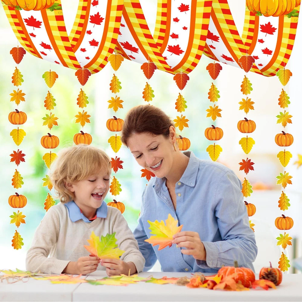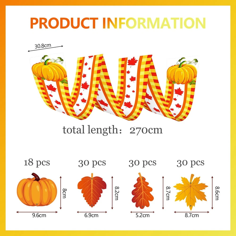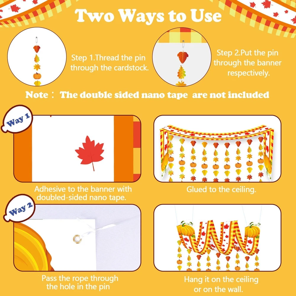 Package Includes: 1 fall ceiling banner 18 pumpkin ornaments 90 leaves ornaments in 3 different shapes 300 x 9cm Plastic Hanging Strings 30 x Silver Copper Pins Versatile Applications: The hanging autumn ceiling decorations can be applied to decorate the doorway, courtyard, ceiling, wall, tree, glass window, tent, furniture, door, fireplace, mantel, reception and so on, adding more Autumn, Thanksgiving, Halloween festive atmosphere. Appropriate Size: The fall ceiling decorations banner is about 35 x 270 cm/ 13.7 x 106 inches; Such a large size is very suitable for hanging on the ceiling of the classroom or living room,indoor or outdoor. How to use: 1.Thread the pin through the cardstock. 2.Put the pin through the banner respectively. 3.Pass the rope through the hole in the pin. 4.Hang it on the ceiling or on the wall. Fall Party Decorations: Enhance your gathering with these enchanting autumn-themed ceiling decorations that exude a cozy fall ambiance. The fall decorations set comprises an autumnal banner, 18 pumpkin ornaments, 90 leaf ornaments in three different shapes, and complementary accessories to elevate your party ambiance. Autumn Atmosphere: These autumn party decorations will complement your seasonal festivities and infuse a warm atmosphere. This autumnal ceiling decor is sure to be a standout feature at your event. Adorn your autumn party with these vibrant supplies to create lasting memories of your harvest-themed celebration. Versatile Usage: These fall ceiling decorations are versatile and ideal for various settings. Whether for autumn parties, harvest gatherings,Thanksgiving party, Halloween party, fall-themed soirees, woodland parties, or seasonal feasts, these autumnal ceiling decorations bring a distinct and lively touch to your event. High-Quality Materials: Made from premium polyester, these autumnal ceiling decorations are durable and resistant to wear. The robust paperboard pumpkin and leaves ornaments are dependable and can be reused for future fall festivities. Easy Assembly:The fall ceiling banner is designed with holes at each of the 4 corners and fitted with a plastic rope, and you can use the safety pins to connect it with colorful garlands, simple and convenient, finally you will get a beautiful fall decoration.