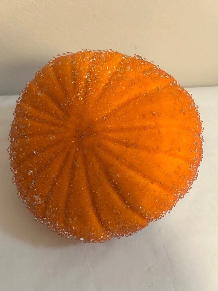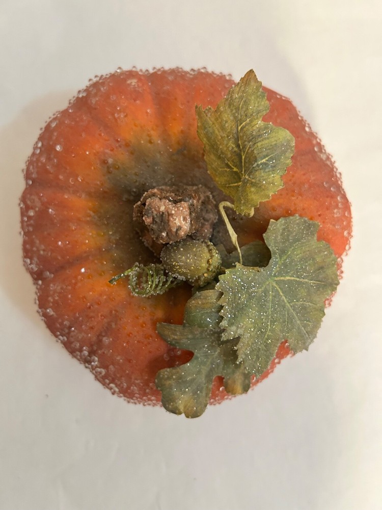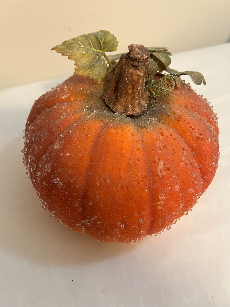 Add a touch of seasonal charm to any space with this iced faux pumpkin figurine. Perfect for FALL, Halloween, and Thanksgiving decorations, its vibrant orange color and intricate ice finish make it a striking centerpiece or a delightful addition to your home decor. Crafted from styrofoam, this large 10" round by 6" tall decoration is lightweight and designed to bring a festive spirit to your kitchen, living room, or even your office. This seasonal decor piece captures the essence of the harvest season and its icy sparkles makes it a rare gorgeous piece! Whether you're looking to accent your festive mantle, this unbranded figurine is a tasteful choice for seasonal flair. It's an exceptional beauty!
