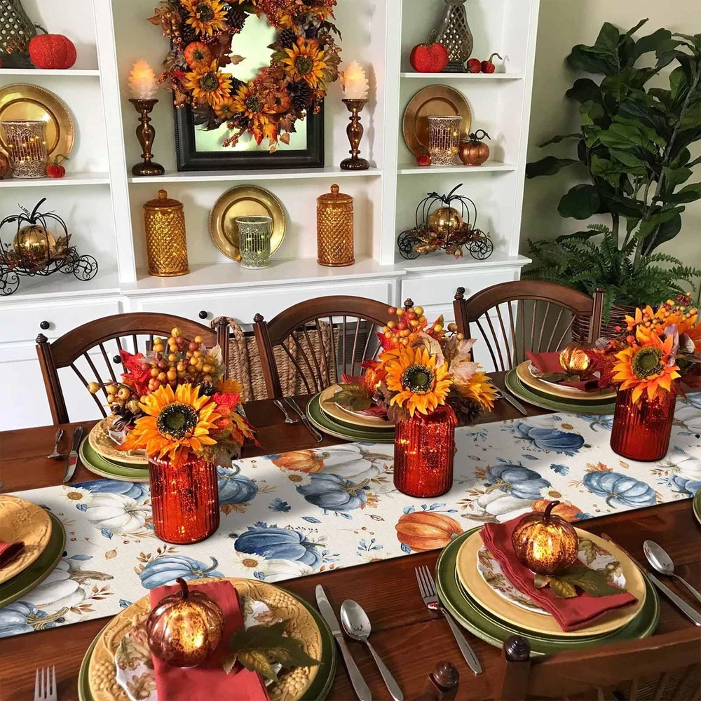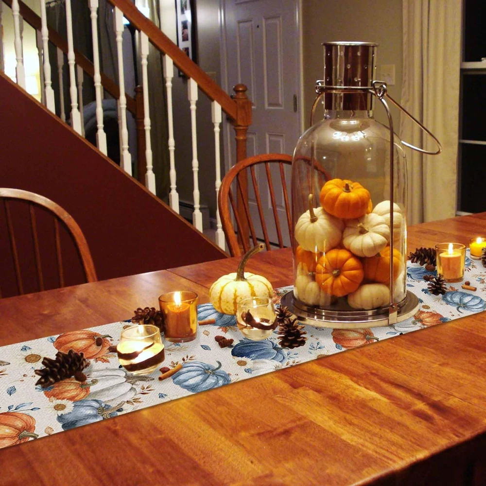 ⌂MEASUREMENT- Our washable table runner for countertop measures 13x36inches (about 33x91cm). The durable table cover is available in a variety of sizes and is suitable for most square/rectangular tables, round tables, dressers, dining table, coffee table, bedside table, shoe cabinets, TV standing etc, creating a wonderful table setting, which is the perfect addition to any home. ⌂MATERIAL- The dining table runners are made of linen cotton blended polyester fabric with triangle brims, the edges of the tablecloth are all stitched, soft and durable, which will last for years to come. The cotton and linen fabric has certain no-slip properties, making it more convenient to use. The waterproof features makes it not easy to get dirty, spilled drinks will not penetrate the table through the table flag. ⌂APPLICABLE- Our elegant dresser scarves are made with modern HD printing technology, with bright and vibrant Autumn Thanksgiving Day Orange Blue White Pumpkin, Blossoming Watercolor Flower with Leaves, Fall Harvest on Burlap Linen patterns that won't fade after long use, suitable for daily use in all seasons, also perfect for table decoration on holiday party, wedding, family dinner, birthday party, graduation, holiday celebration, thanksgiving, Christmas, New Year, Valentine's Day, etc. ⌂FUNCTION- A practical dining table scarf can create the perfect setting for your home decor. Its exquisite patterns can add a touch of elegance and energy to your table, create a new look to your tabletop, instantly transforming it into a focal point. Whether you're hosting a special celebration or enjoying your daily meal like BBQs, picnic or family gathering, our table runner will enhance the ambiance and make every meal a pleasant experience. ⌂EASY CARE- Machine washable at low temperature or cold water. However, hand washing is recommended to ensure its longevity. Please do not add blench. It is foldable and easy to store, allowing you to reuse it for multiple occasions. With its durable and reusable nature, it's a practical and eco-friendly choice for your dining table.