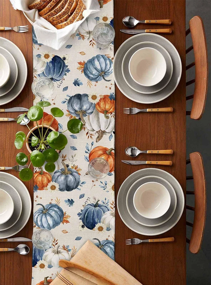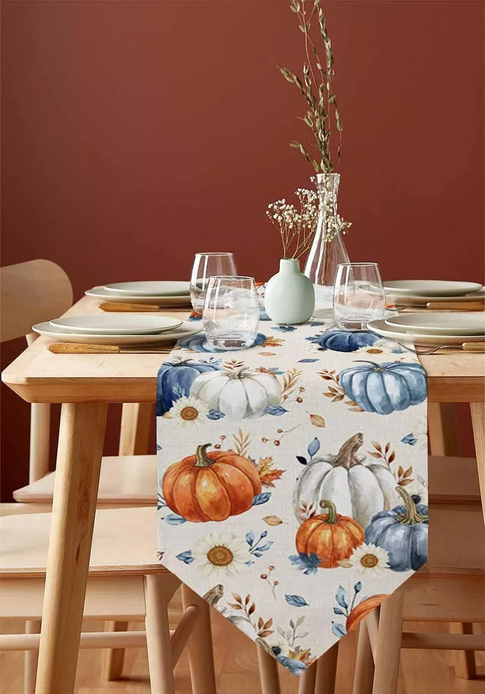 Fall Table Runner Thanksgiving Watercolor Pumpkin Autumn Harvest Tabletop Run...