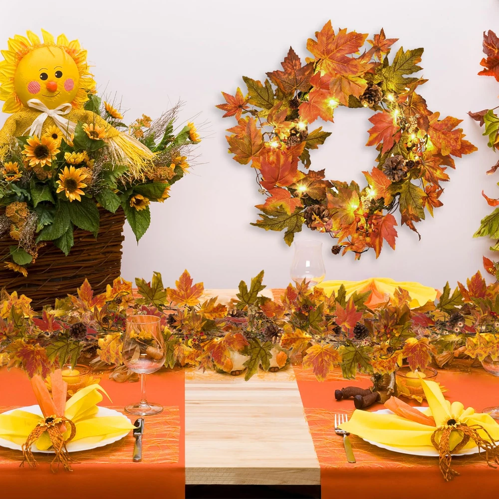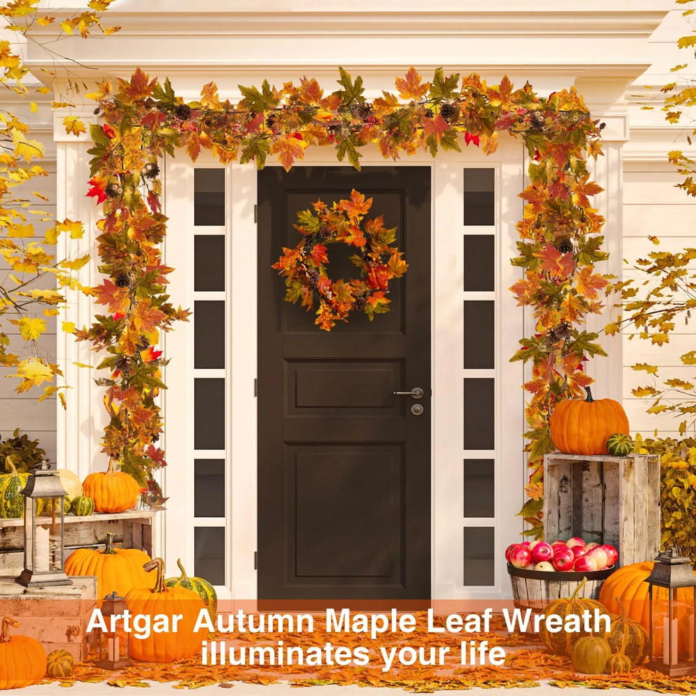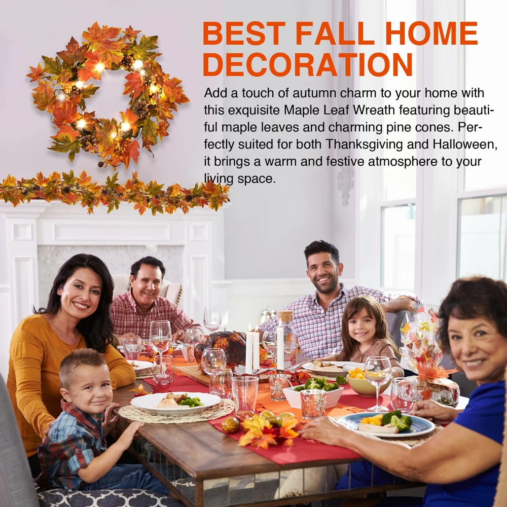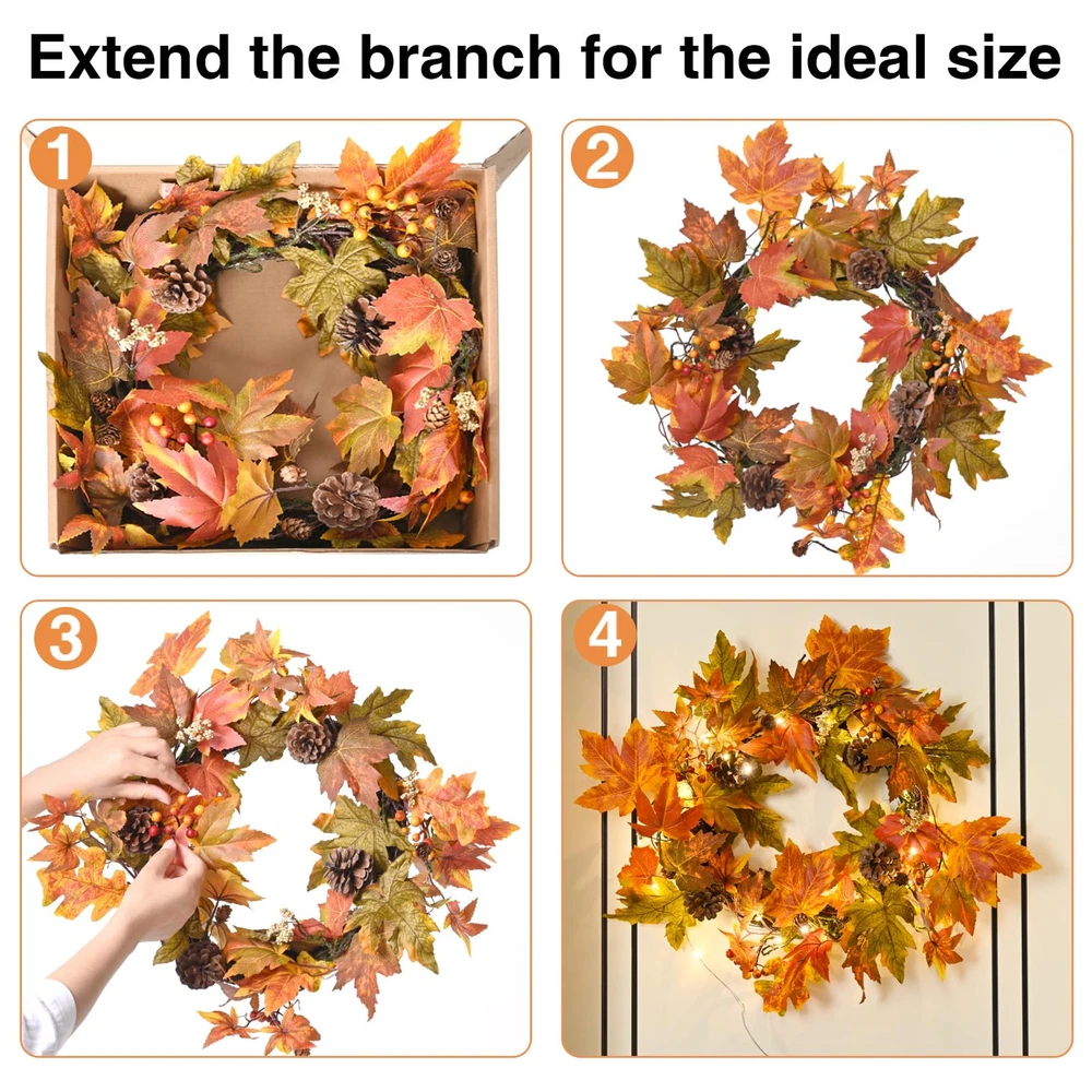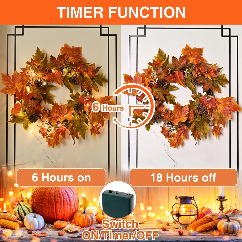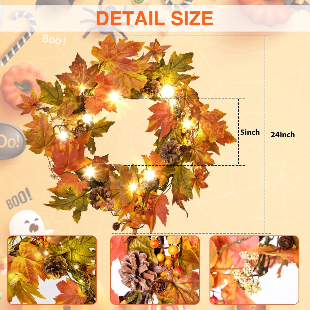 Elevate Your Fall Decor: Add a touch of warmth to your home with the fall wreaths for front door. Measuring 24 inches, this handmade wreath features a variety of leaves, large and small pine cones, and berries, creating a charming fall atmosphere Wreath with Timer Lights: Enjoy the cozy glow of 30 warm-colored LED lights that come with a convenient timer function (6 hours on, 18 hours off). Powered by 3 AA batteries (not included), this front door wreath effortlessly enhances your fall and Thanksgiving decor Exquisite Handmade Design: Each fall wreath is meticulously crafted to warmly welcome guests. Hang it on your front door or use it as a centerpiece with candles. Whether for your seasonal decor or as a thoughtful gift, this unique fall door wreath is for farmhouse charm Versatile Decor: Hang this maple leaf wreath on your front door, fireplace, wall, or window to welcome guests with a touch of fall charm. It's also perfect for indoor and outdoor settings decor, such as the farmhouse, living room, dining room, or office Thoughtful Packaging: The fall wreath is carefully packed in a gift box to ensure it arrives in perfect condition. Upon unpacking, adjust the branches to achieve the maximum size of 24 inches