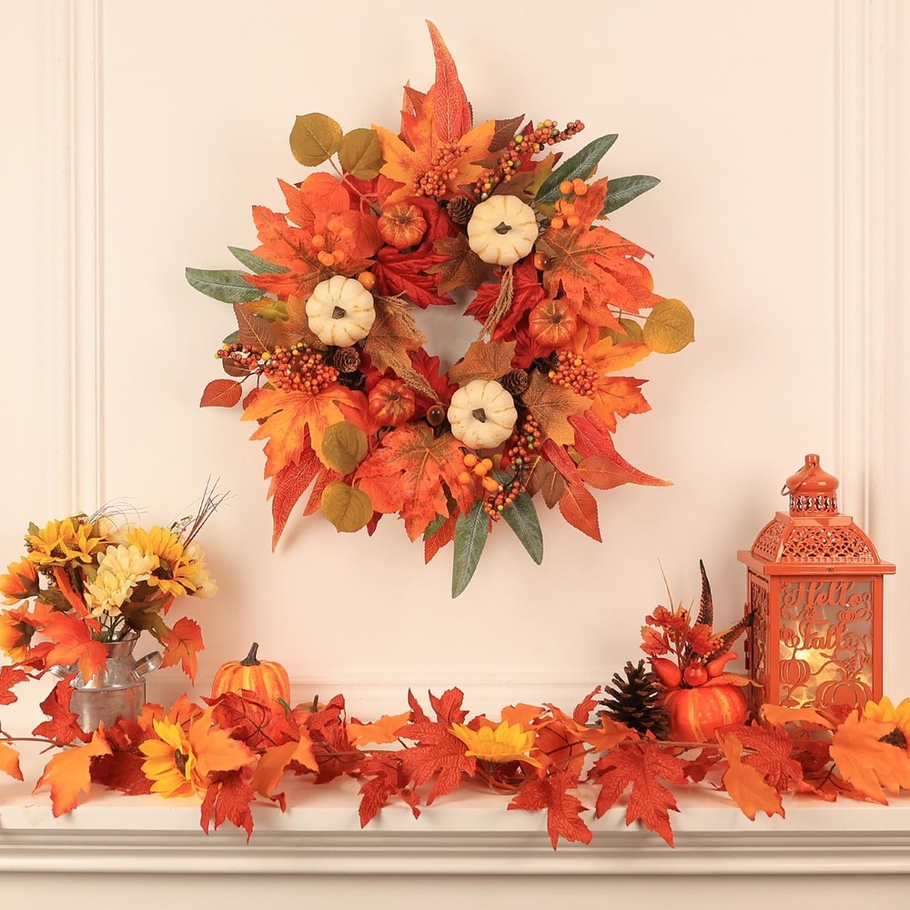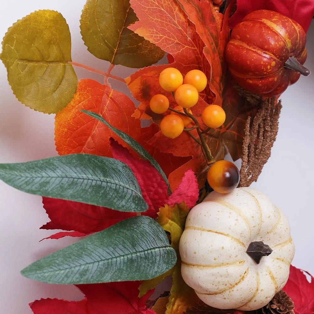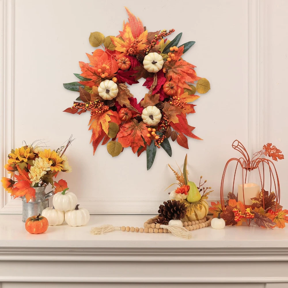 Fall Wreaths for Front Door, 21" Fall Wreath with Maple Leaves Pumpkin Berries, Autumn Decorations for Home, Artificial Harvest Door Wreath Outside, Window, Wall, Fireplace, Thanksgiving Decor 🍂【Fall Decorations for Home】: Fall door wreath is designed with natural sturdy vine base, Handcrafted with corlorful artificial maple leaves, big foam pumpkins, Berries, pine cones, acorns. It is sure to add a touch of autumn charm to your home. The front side of the lifelike polyester fabric material gives them a realistic look and feel, while being smooth to the touch and never crinkling. Get ready to add vibrant autumn hues to your everyday life with this beautifully consistent design. 🍁【Fall Wreath Farmhouse Decor】: This artificial maple leaf wreath measures 55cm/22 inches when fully expanded and the rattan ring diameter:30cm/12inches. Our Thanksgiving door wreath will transform your bland front door into a vibrant, attractive entrance. Let's welcome every guest with this autumn wreath, creating beautiful memories together,sharing joy and happiness! It can be displayed all fall season long, through Halloween and Thanksgiving. 🍂【Widely Used】: No matter where you choose to display your fall leaf wreath - be it indoors or outdoors, above your fireplace mantel, on your front door, living room wall, window, porch, or even in your farmhouse - it will look great! You can also give it as a gift to thank your friends and family. This floral wreath is sure to bring an enjoyable ambiance to your home during this harvest season. 🍁【Premium Material】: These wreath made from High quality and durable polyester fabricto to ensure the quality of the wreath. The vibrant red, orange, and yellow hues mimic the natural beauty of autumn leaves, adding a realistic touch to your fall decorations. You can hang the fall wreath wherever you like. In addition to the exquisite appearance, we also pay great attention to the convenience of use. Each fall wreath is packed in a sturdy cardboard box for convenient storage after use. 🎃【Top-quality Service】:Each fall decoration is carefully inspected before shipment for quality assurance, is committed to giving buyers a good shopping experience. If you have any questions, please feel free to us, we will give you a satisfactory solution within 24 hours.