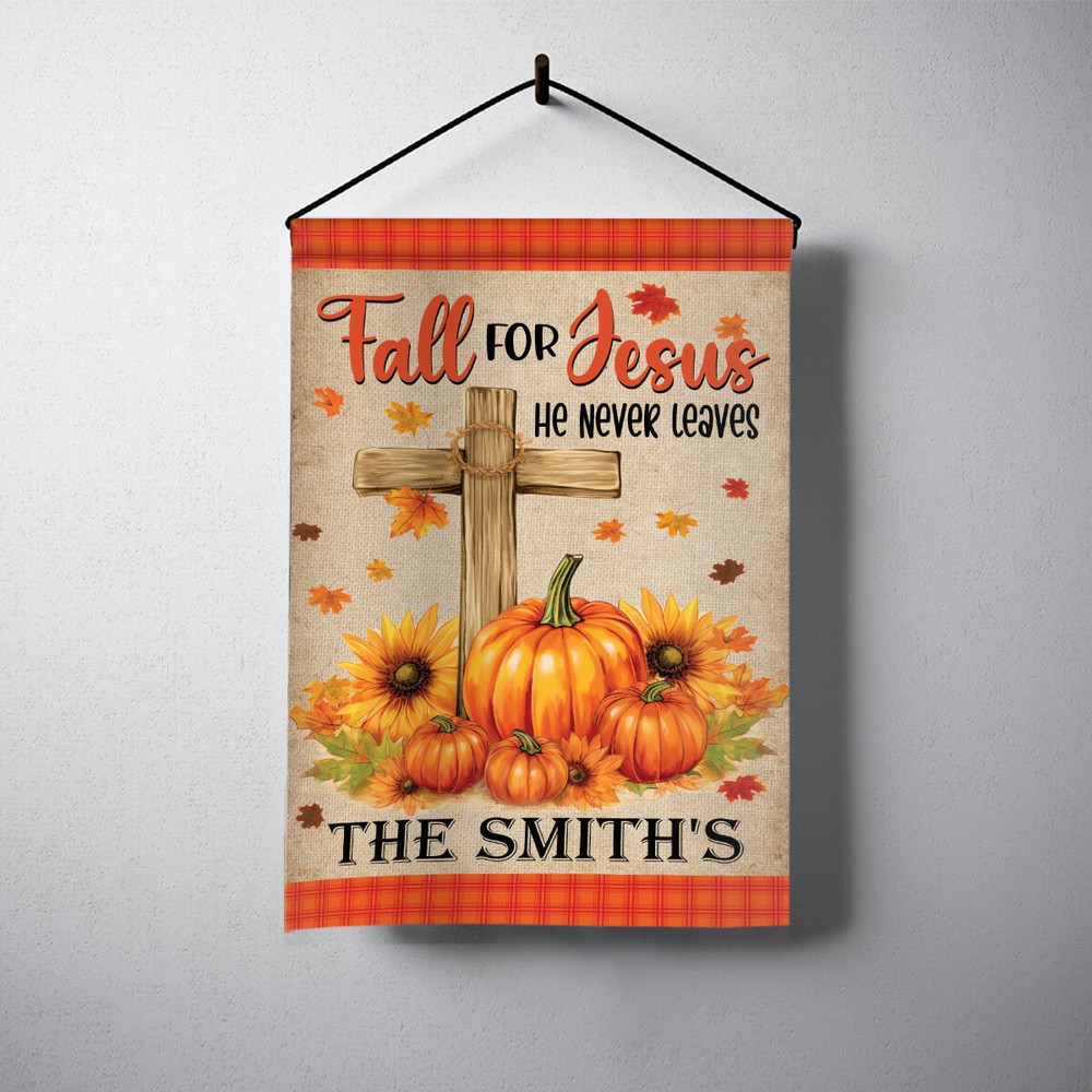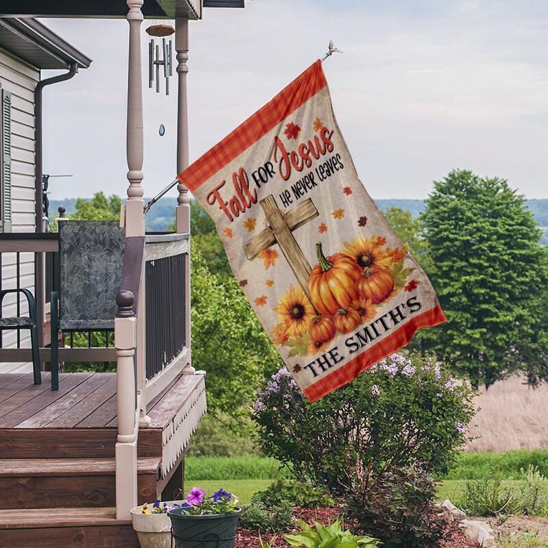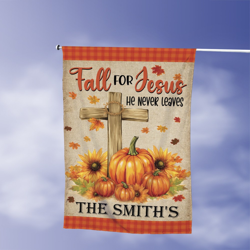 Fall For Jesus He Never Leaves Garden Flag, Thanksgiving Garden Flag, Church Flag, Welcome Fall Garden Flag ID-0922-ZU2A High-resolution digital printing on durable corflute material Free from holes, grommets, strings, or nails Completely customizable & available in 2 pre-defined sizes 2-sided printing Flag stands and poles not included. Printed on a premium polyester with vibrant colors. Perfect for indoor and outdoor use. Easy to hang, fold up and pack away. Due to the different monitor and light effect, the actual color of the item might be slightly different from the visual pictures.