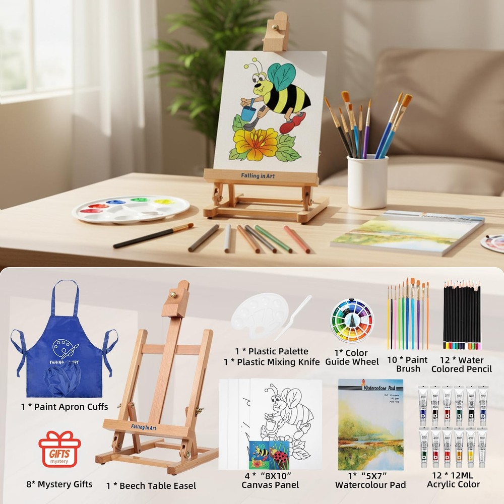 Falling in Art Painting Set for Kids with Table 43 PCS kids easel set, Blue Product Details Ready to Go Kids Painting Supplies: Falling in Art 43-piece kids easel set has everything for children to create fantastically enjoy, including 1 tabletop easel, 1 watercolor pad 5"x7", 12 vibrant acrylic paints, 4 canvas panels 8"x10", 12 colored pencils, 10 paint brushes in different shapes and sizes, 1 mixing knife,1 plastic palette and 1 waterproof apron with cuffs. Ideal Present for Kids: Falling in Art acrylic painting and watercolor art set is a wonderful gift for children, suitable for boys and girls as a birthday or festival gift. They will get excited and love our table easel starter kit because it is fun and easy to use. MDF canvas panels and acid-free watercolor pad will satisfy numerous practice needs. Numerous Canvas Panels: There are 4 canvas panels in this starter kit. 2 printed panels with cute pre-made drawings can be painted on directly and 2 blank canvas panels will give kids more options to run imagination. All parts from this all-in-one art drawing kit are safe and non-toxic, it's a good choice for students to explore their fullest potential in drawing, acrylic or watercolor painting. Beechwood Display Easel: Falling in Art mini tabletop easel extends to accommodate a canvas up to 12" high. Adjustable angles from flat to 90 degrees to find a comfortable drawing angle. Metal knobs are easy to tighten and ensure stability. H-frame construction and non-slip rubber feet make this mini easel very stable, it's nice to act as a display stand to catch the finished paintings. From Us: Falling in Art aims to provide tons of premium painting art supplies, brushes, easels and easel sets, canvas panels, and more to satisfy your needs to be an artist. Once you meet issues when using our products, pls feel free to contact us.