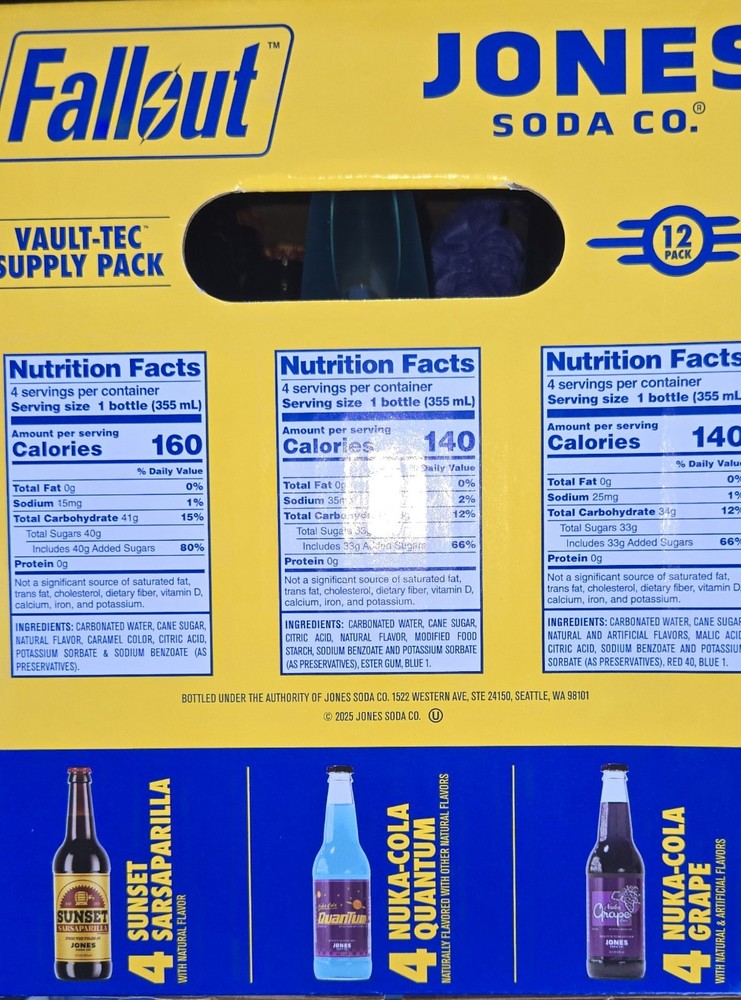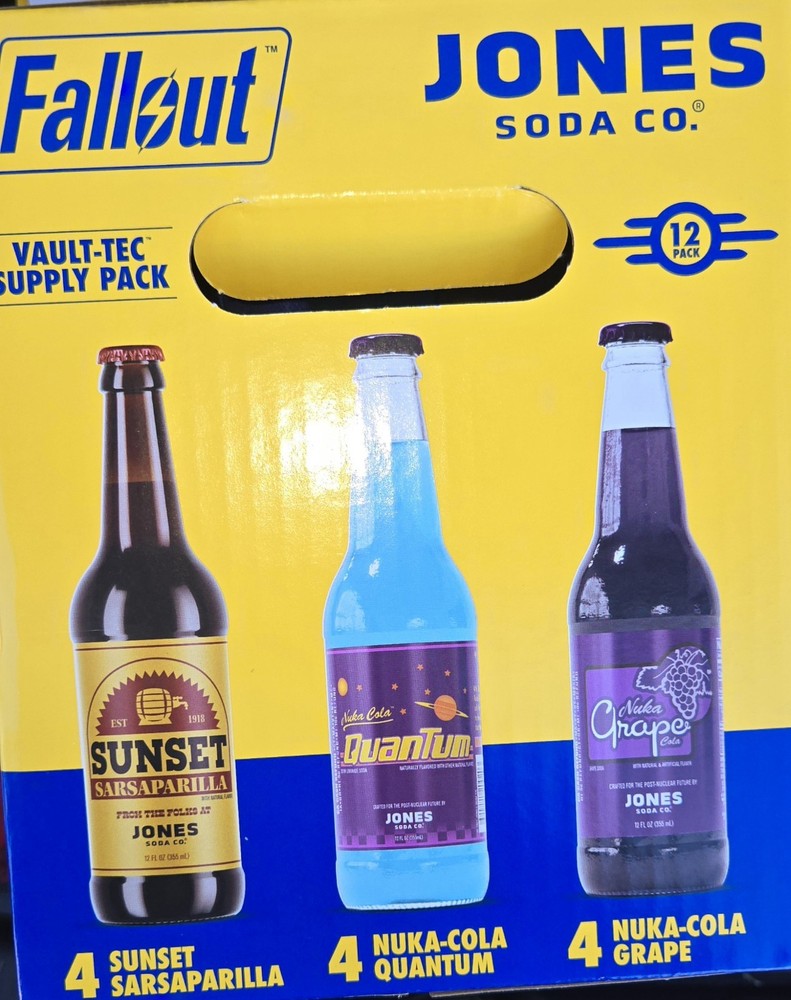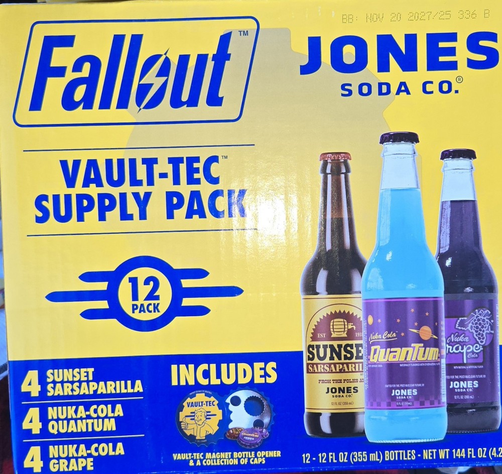 The Fallout x Jones Soda Co Vault-Tec Supply Pack is a limited edition 12 pack exclusive to Costco. This collaboration between the video game franchise Fallout and Jones Soda includes a mix of food and drink items inspired by the game's world. Developed by Bethesda and published by Bethesda Softworks, this action/adventure game set in the year 2025 offers players an immersive experience in the post-apocalyptic wastelands of the United States. Collectors and fans of the Fallout series will appreciate this unique memorabilia item that combines both elements of the game and the soda brand.