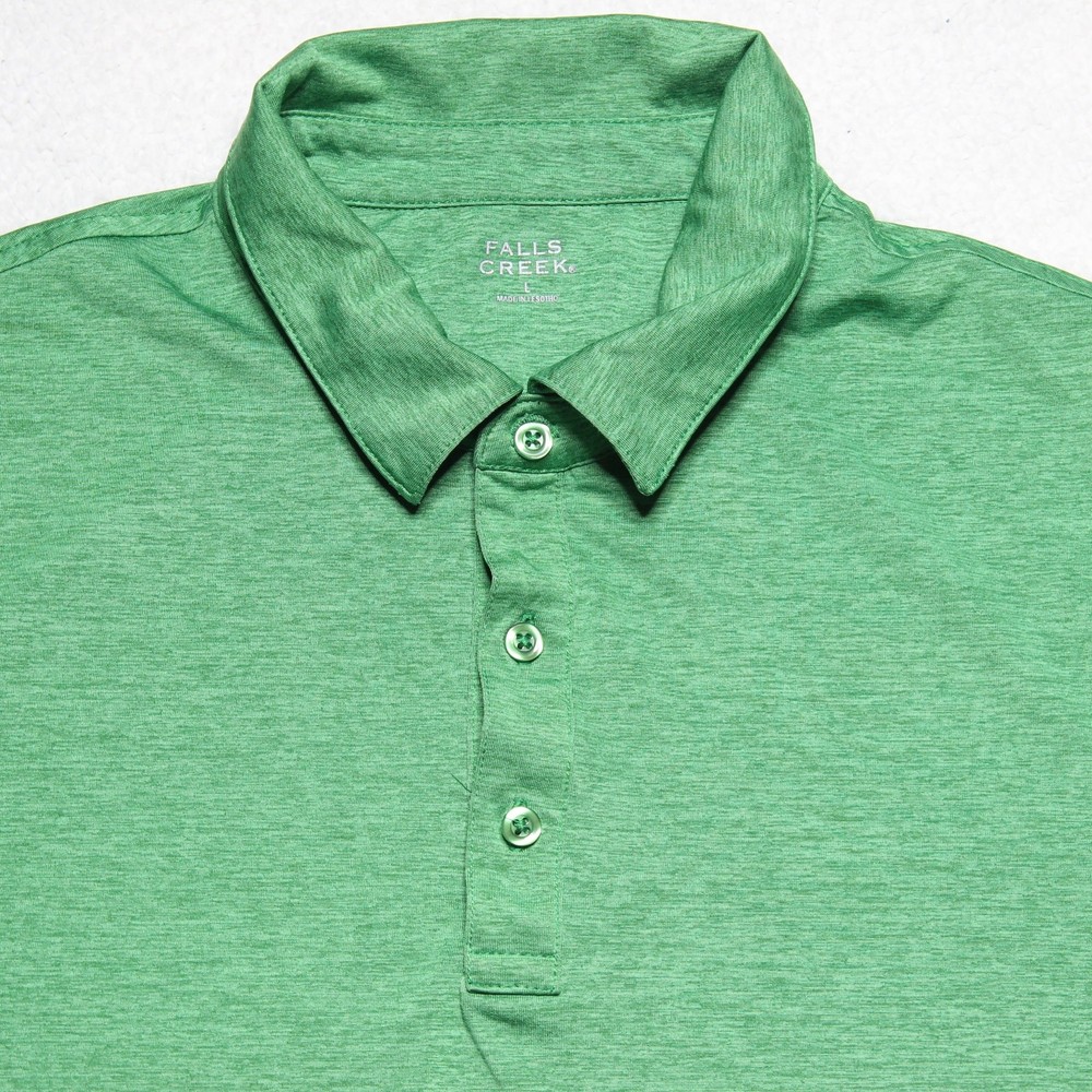 Comfortable and lightweight Falls Creek polo shirt in men’s size large. This short sleeve shirt features a heathered green color, three-button placket, and stretch fabric for casual everyday wear or light activity like golf. Soft and breathable with a classic fit. Brand: Falls Creek Size: Large Fit: Regular Color: Heathered Green Material: Polyester/spandex blend (tag not shown, inferred from fabric feel) Features: Stretch fabric, short sleeves, three-button collar Measurements (approximate): Chest: 23" pit to pit Length: 30" shoulder to hem Condition: Excellent pre-owned condition with no stains or holes. Lighting Note: Color may vary slightly due to lighting differences during photography.