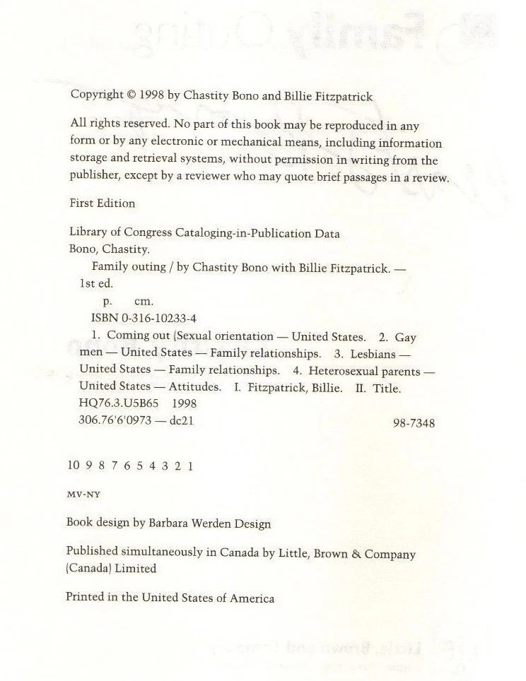 UP FOR SALE IS A 1998 LITTLE BROWN HARDC0VER 1ST EDITION / PRINTING ( 10 9 8 7 6 5 4 3 2 1 ) OF - ' FAMILY OUTING 'WRITTEN AND SIGNED ON THE TITLE PAGE BY CHAS BONO ( THEN SIGNING CHASTITY) . TOP OF PAGE EXTERIOR AND PART OF THE SIDE PAGE EXTERIOR HAVE A SPILL SPOT AND BACK HALF OF PAGES HAVE CORNER WEAR AT TIP. BOOK BOARDS HAVE LIGHT EDGE/CORNER WEAR.AND DJ HAS LIGHT EDGE/CORNER AND SURFACE WEAR. OVERALL CONDITION IS GOOD . PLEASE SEE ALL PHOTOS.THANKS FOR LOOKING AND PLEASE CHECK OUT MY OTHER STORE ITEMS. All S igned books featured have been purchased at bookstore signings or after the signing, book fairs, estate sales, and other reputable dealers. We do not issue individual certificates of authenticity, but do unconditionally guarantee that all signed books have been hand signed by the stated Author of the book and are not a copy or forgery. Shipping is free for media mail in the US only with a 4 - 8 day delivery time. U.S Flat Rate Priority mail is available at USPS rates with 3 - 5 day delivery time for US only. International shipping is by USPS First Class International mail only. Tracking number included. Items shipped within 24 hours after purchase on business days - Monday through Friday. Refunds given as money back less return postage upon safe return of item. Please contact if there is a problem so we can help. Not accepting best offers at this time. Thanks.