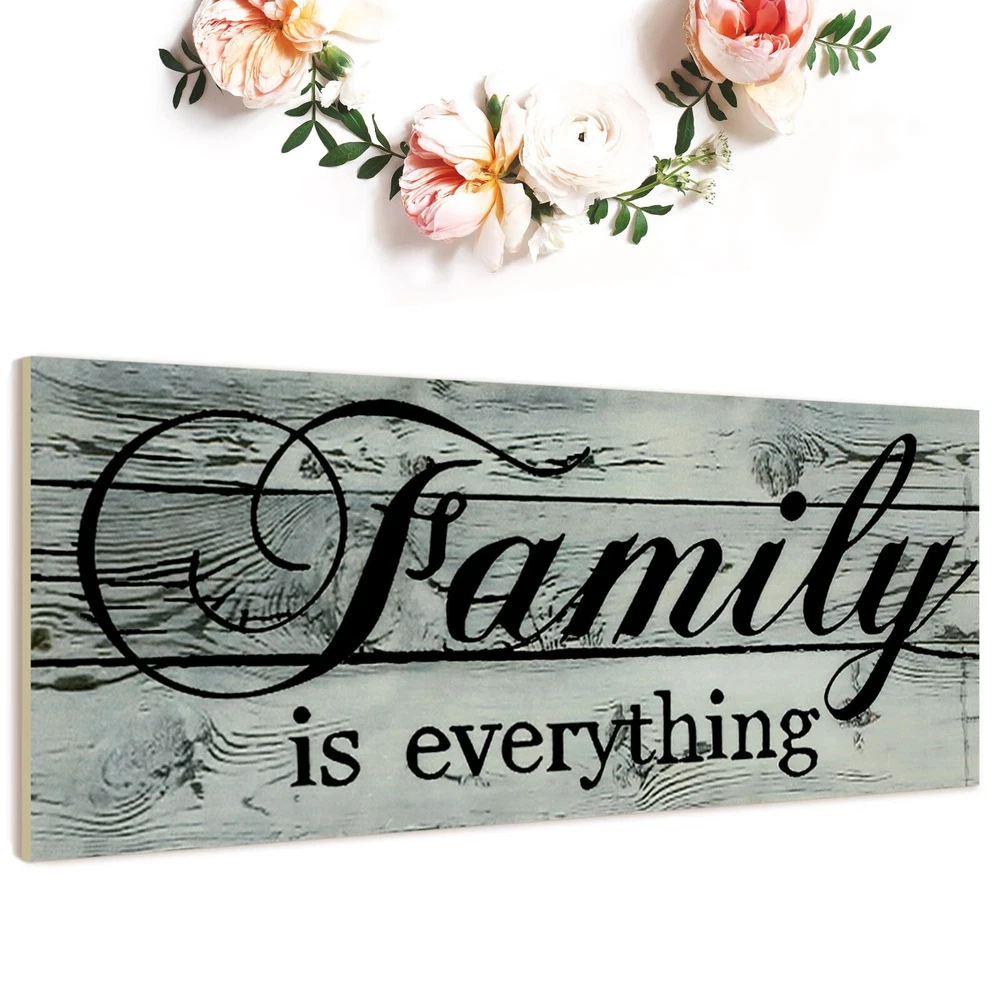 Features: Practical and useful: The retro design of family wooden sign is suitable for different decorative themes, such as rustic, farmhouse, woodland, bohemian, vintage, and hippie, as well as a thoughtful present for hostess, moms, friends, teachers on bridal showers, birthdays or Christmas. Nice home decorations: The wooden signs are three-dimensional, they will bring an attractive landscape to your living room, bedroom, gallery, walls, dining room, bathroom, office and so on. Specifications: Material: wood Size: approx. 13.5 inches in length, 4.68 inch in width Color: blue gray Package includes: 1 x Family wood decoration Note: Manual measurement, please allow little size errors. What you can get: you will receive 1 piece wood sign printed with the saying of family is everything, vintage home decor accents to bring farmhouse charm to any space, bringing you delightful mood Quality material: the family sign is made of quality wood, durable and safe to use, with sanded surface and wood texture, neat edge won't hurt your hands and body, convenient for you to complete home decoration Suitable dimension: wall hanging sign decor measures approx. 13.5 inches in length, 4.68 inch in width; It is lightweight that easy to be hung on wall or door Easy to use: the family sign have 2 metal hooks on the back, which to meet your hanging needs in various occasions, well match with any home decor style Widely applicable: farmhouse wall decor is suitable for indoor or outdoor use, such as, kitchen, bedroom, living room, hallway, porch, balcony garage and so on; You can hang it on the door, window, wall or fireplace, easily adding nice decoration effect
