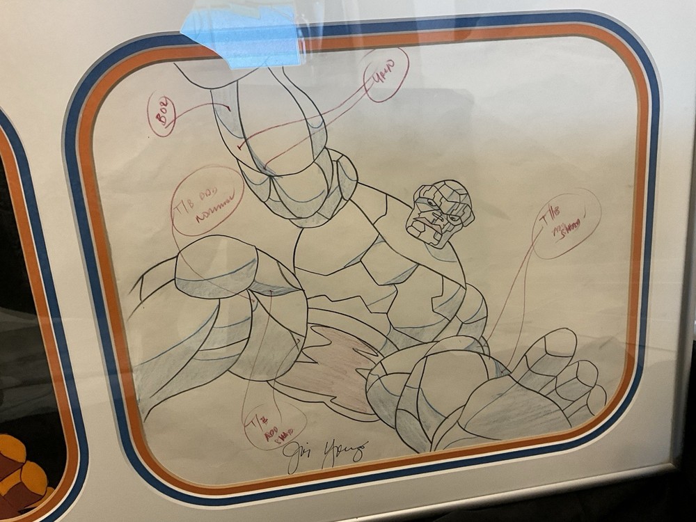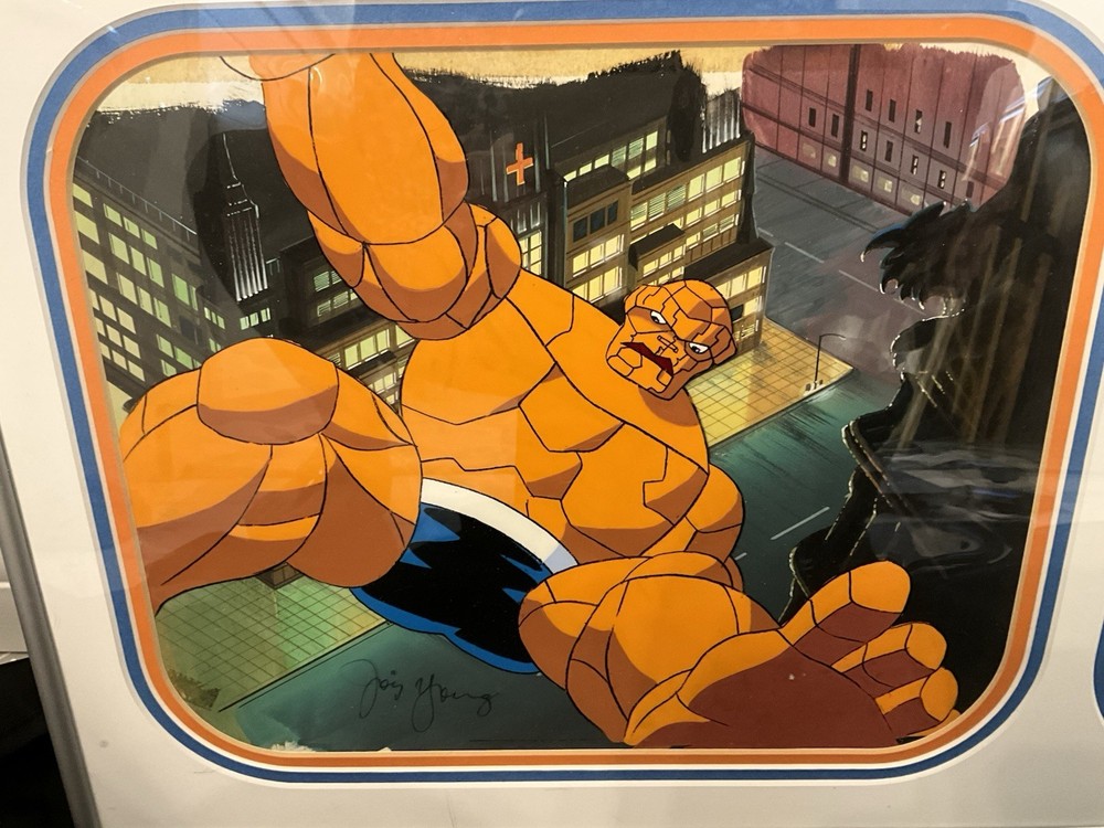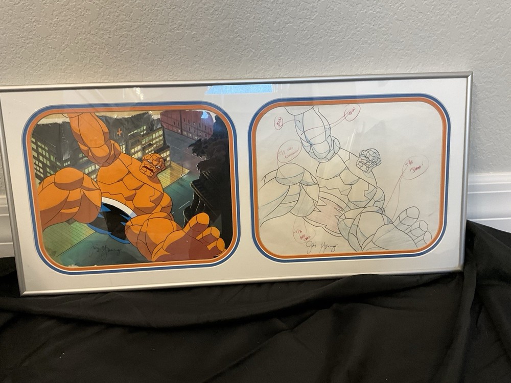 The product is an original signed cell drawing of "The Thing" from the Marvel Comics universe, specifically from the Fantastic Four series. PLUS the final version depicted in the artist sketch. Both are signed by the artist, Jim Young. The artwork was created by Filmation, making it an original piece within the tradition of US Comics. This collectible item showcases the iconic character within the beloved Fantastic Four universe, making it a must-have for fans and collectors alike. The pictures are framed, measuring 29.5” x 13.25”. It really is a unique and special piece for the true Marvel superhero fans!