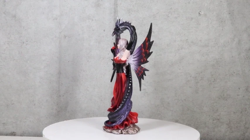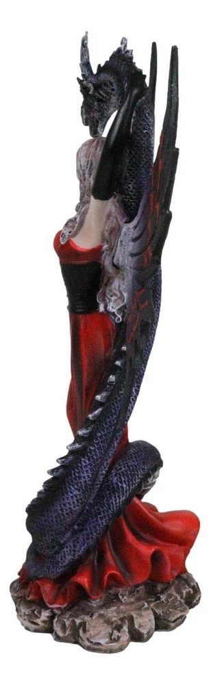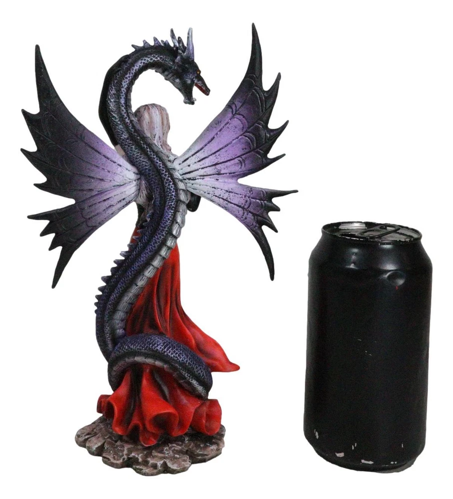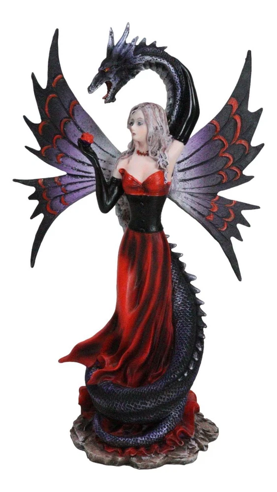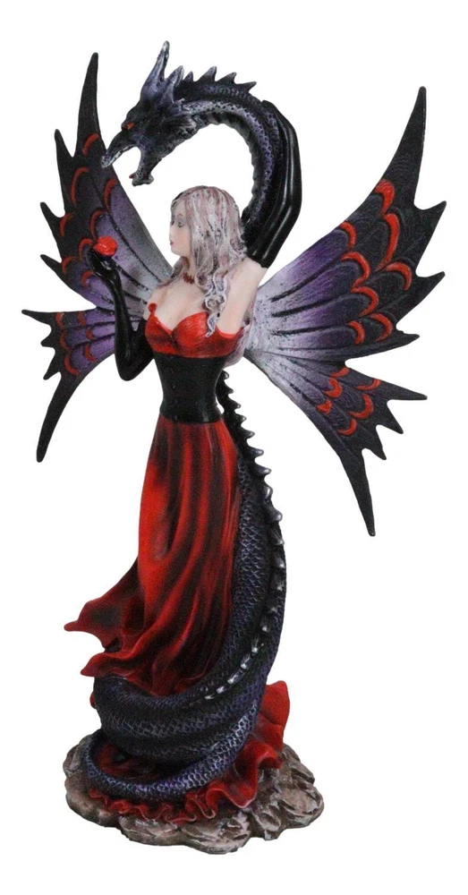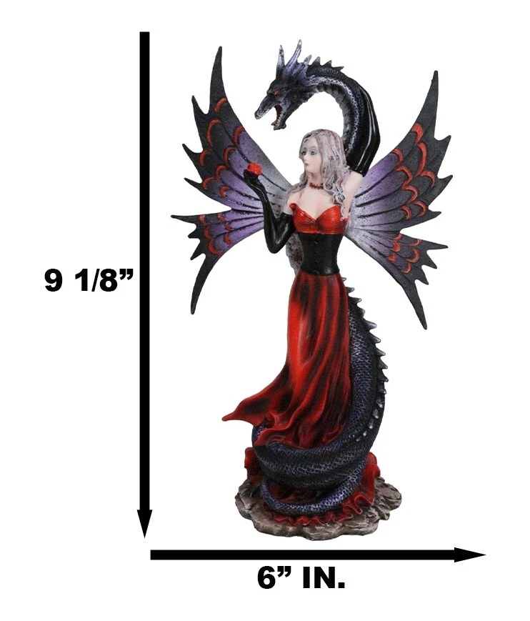 • This Gothic Fairy With Black Dragon Statue is approximately 9.25" tall, 6" long and 3" deep. It weighs about 1 pounds. • This Gothic Fairy With Black Dragon Statue is made of designer composite resin, hand painted and polished individually. Color Tone may vary slightly from pictures. • Indulge in the dark allure of our Red Gowned Gothic Rose Fairy with Black Grendel Dragon Figurine, a captivating blend of mystery and fantasy. This intricately crafted figurine features a gothic rose fairy adorned in a striking red gown, accompanied by a majestic black Grendel dragon. The exquisite details and contrasting colors create a mesmerizing and enchanting tableau.