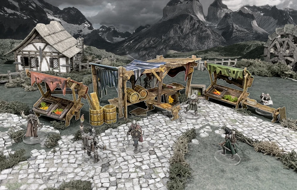Fantasy Terrain Marketplace - D&D Warhammer DND Town Village Market Scenery THG This pack upgrades your gaming table with a bustling marketplace. It includes a large marquee, two stalls, & a variety of barrels, crates & useful scatter terrain to add immersion to your board. The pieces are compatible with the rest of the Battle Systems Fantasy range. The terrain is supplied flat-packed on high-quality, high-density card, printed in full color on both sides, so no painting required! The terrain requires assembly, & some smaller parts will require glue. CONTENTS - 1 Large Market Stall - 2 Small Market Stalls - 3 Benches - 4 Barrels - 5 Crates - 5 Assorted Scatter Components & Accessories -