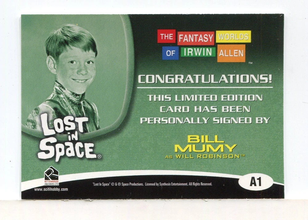 Description: Fantasy Worlds of Irwin Allen Lost in Space Bill Mumy Autograph Card Contents: Authentic autograph card A1 featuring Bill Mumy as Will Robinson. Manufacturer: Rittenhouse Archives, 2004. Condition: Mint/near mint.