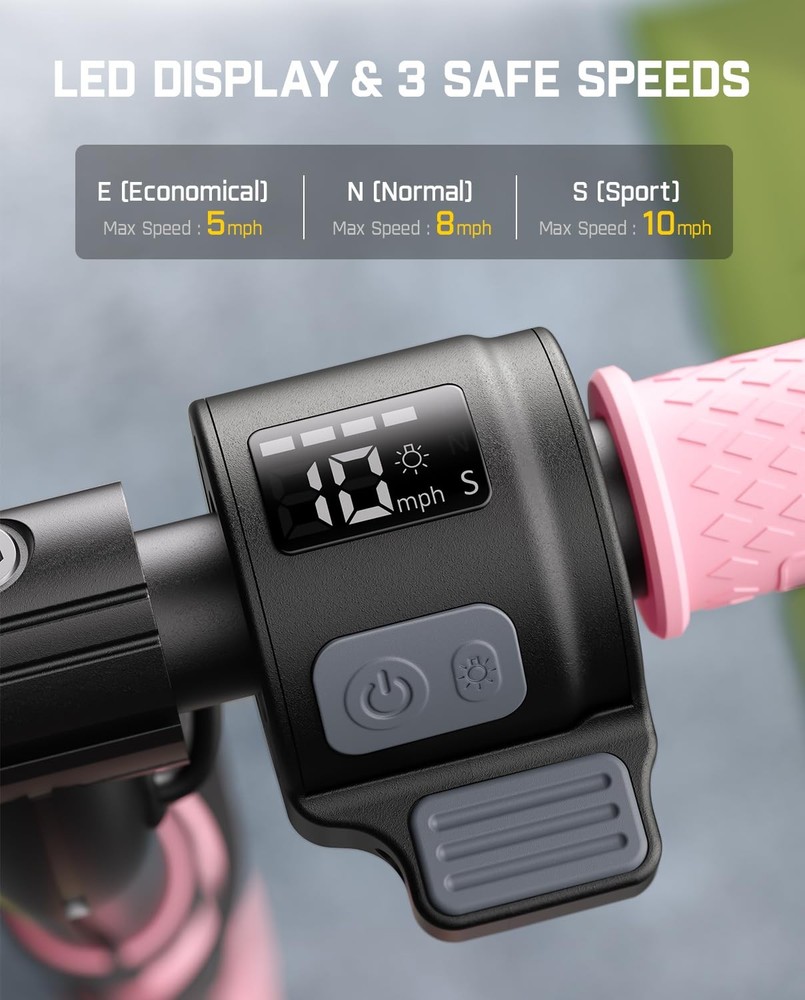 This electric scooter is a blast for kids! The colorful flashing LED lights add fun and safety, especially at night. With three speed options (5, 8, or 10 mph), it’s perfect for different skill levels. The adjustable handlebar grows with your child, and the battery display keeps you informed. Lightweight yet sturdy, it’s easy to carry but durable for daily rides. Parents will love the safety features, while kids adore the cool design and smooth ride. A fantastic gift that balances excitement and security!