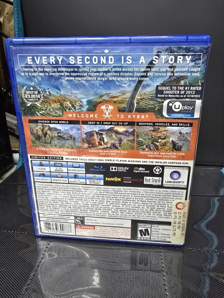Far Cry 4 Limited Edition Walmart PlayStation 4 Comes with everything shown in the pics. PICTURE SHOWN IS ACTUAL ITEM RECEIVED. Please refer to pics as item may have minor wear or other imperfections. If you have any issues whatsoever please let me know. Your item is guaranteed to work and will be promptly replaced or refunded otherwise. If you have any questions or concerns please send me a message. FEEDBACK - 5 Star Feedback is appreciated. If you have any problems or concerns with your purchase please let me know before leaving feedback. Note to International Buyers - Shipping can take as long as 4 weeks depending on buyer location and shipping service. If you have any questions regarding shipping please send me a message. I will Combine Shipping on multiple orders. Make sure multiple items are in your Ebay Shopping cart before requesting a total.