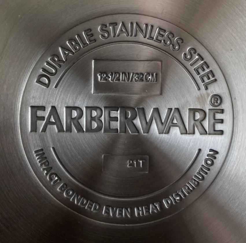Elevate your cooking experience with the Farberware Classic Traditions Stainless Steel 12.5'' Ceramic Nonstick Frying Pan. Designed for both electric and gas stovetops, this versatile pan features a durable stainless steel construction coupled with a nonstick surface that ensures healthy cooking and easy cleanup. The pan's round shape and 12.5-inch diameter provide ample space for a variety of dishes, while the copper-colored exterior adds a touch of elegance to your kitchen. Whether sautéing vegetables or frying eggs, this frying pan is a reliable addition to your cookware collection. This Farberware Classic Traditions Stainless Steel 12.5'' Ceramic Nonstick Frying Pan is used and on great shape. Please view all listing photos and message me with any questions you may have or if seeking additional photos. Comes from a pet free some free home and I have been the only owner. Orders are packed and sent same day or next business day. Timeless tradition meets cutting edge technology with the Farberware Classic Traditions Stainless Steel Ceramic Nonstick Frying Pan. This essential piece of cookware features a traditional frying pan design with mirror-polished stainless steel exteriors to deliver a radiant touch of kitchen style. The 12.5-inch skillet also boasts a ceramic nonstick cooking surface for superior searing, enhanced browning, and easy food release. A full cap base ensures fast, even heating on all stovetops, including induction and is dishwasher safe for effortless cleanup. Oven safe to 350°F, this stainless steel fry pan comes ready out of the box to cook all your family favorites. LONG LASTING FRY PAN: Durable, polished stainless steel construction incorporates a full cap base for fast and even heating COOK & RELEASE: Frying pan boasts a ceramic nonstick cooking surface for superior browning and easy food release DISHWASHER SAFE: Feel free to toss these durable pots and pans in the dishwasher for an effortless cleanup FINISH IT OFF: Stainless steel skillet is oven safe to 350°F to safely finish meals in the oven