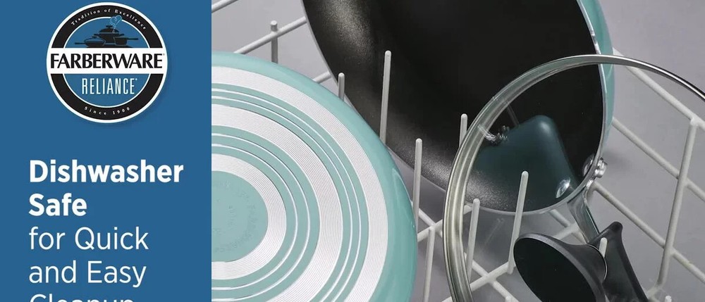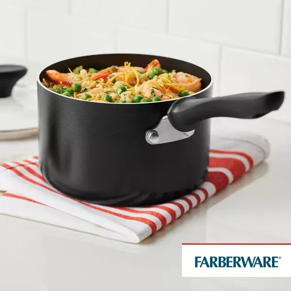 Everyday home cooks can count on the quality performance and easy cleaning of the Farberware Reliance Aluminum Nonstick 2-Quart Saucepan with Lid. The large saucepan features sturdy aluminum construction for efficient cooktop performance and fast, even heating throughout the pan base and sides. The pan interior is finished in durable nonstick that makes cleanup simple and helps promote healthier cooking, with less fats and oils required. The saucepan’s colorful exterior is easy to clean and adds a pop of kitchen style. Dishwasher safe for quick cleanup. Oven safe to 350°F. QUALITY COOKWARE: Saucepan features sturdy aluminum construction for fast, even heat and reliable cooking performance PREMIUM NONSTICK: Long-lasting nonstick saucepan provides effortless food release for healthier cooking with easy cleanup USE LOW TO MEDIUM HEAT: Our nonstick skillets perform their best and last the longest when used on low to medium heat with matching burner sizes LOCK IT IN: The saucepan's tempered glass lid seals in heat and flavor for rich sauces and reductions QUICK TO CLEAN: Saucepan and lid are dishwasher safe for easy cleaning STOVE TO OVEN: Nonstick saucepan is oven safe to 350°F