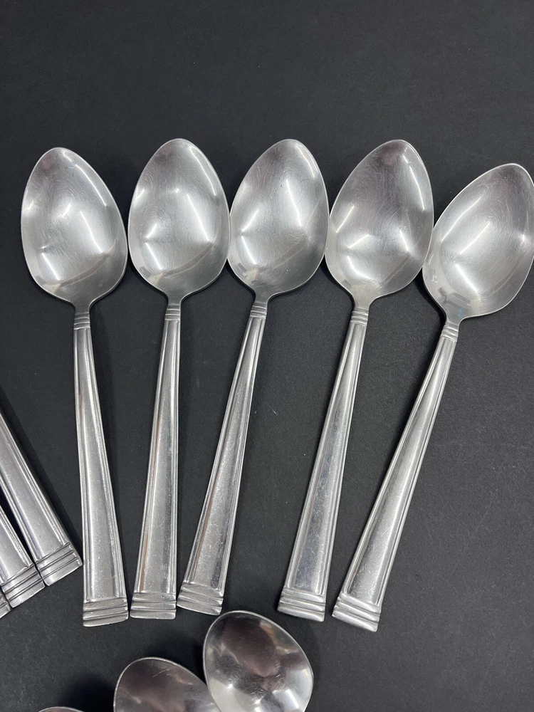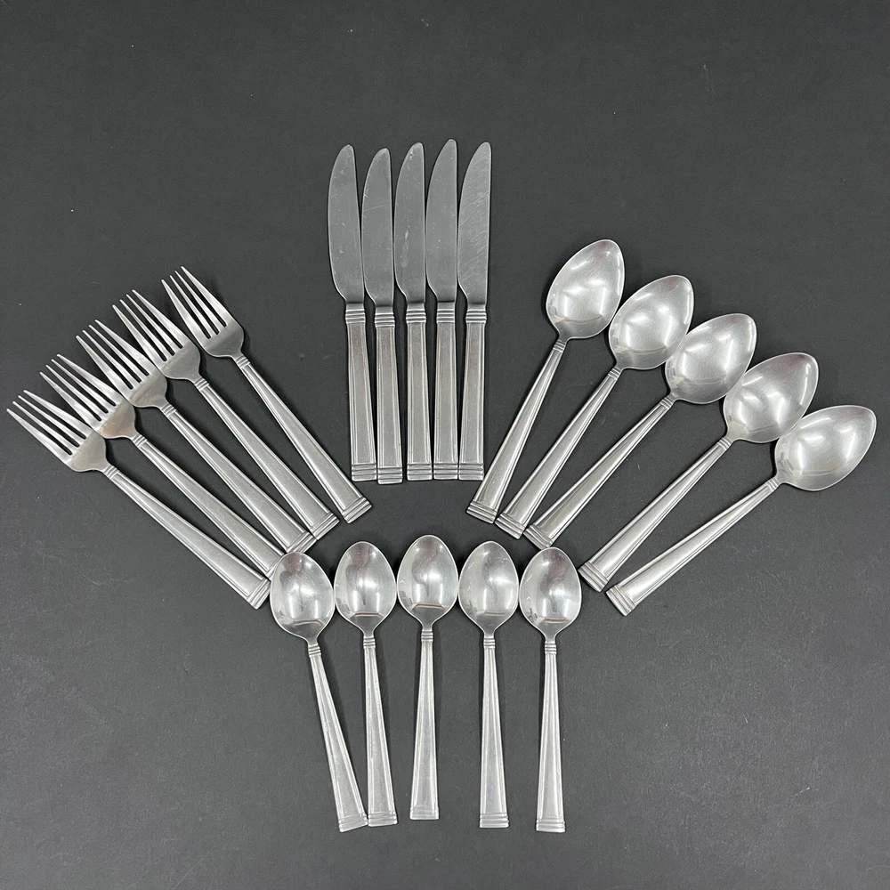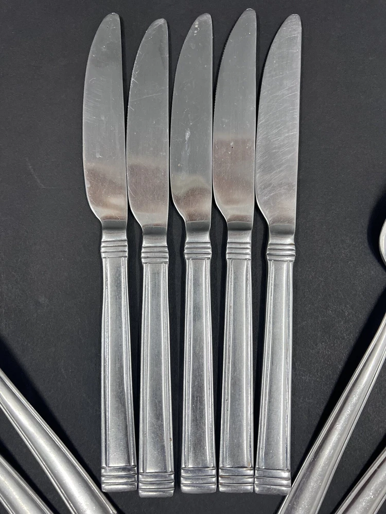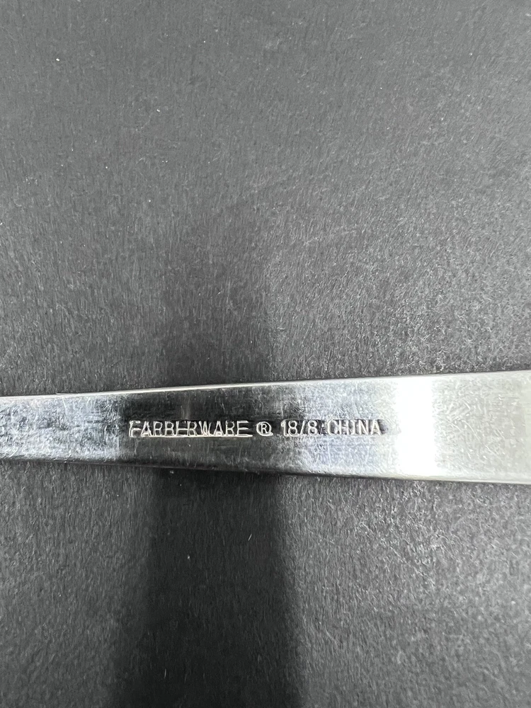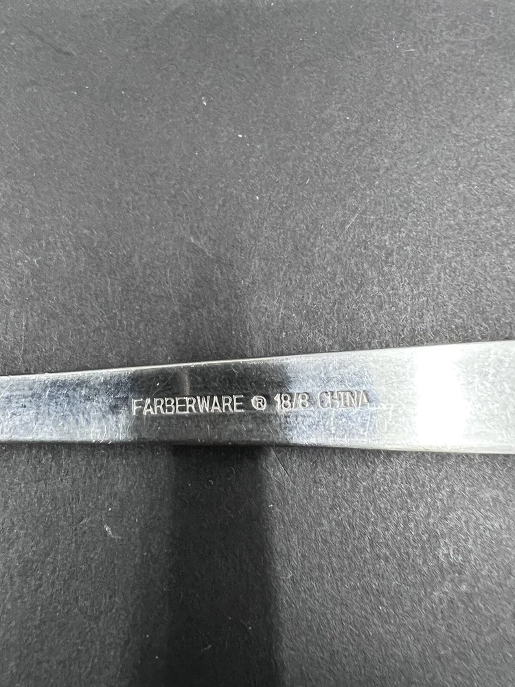Material: Stainless Steel Type: Set Set Includes: Fork, Knife, Serving Spoon, Spoon Style: Contemporary Color: Silver MPN: FRW39 Department: Adults Handle Material: Stainless Steel Handle Pattern: Solid Country/Region of Manufacture: China Brand: Farberware Finish: Satin