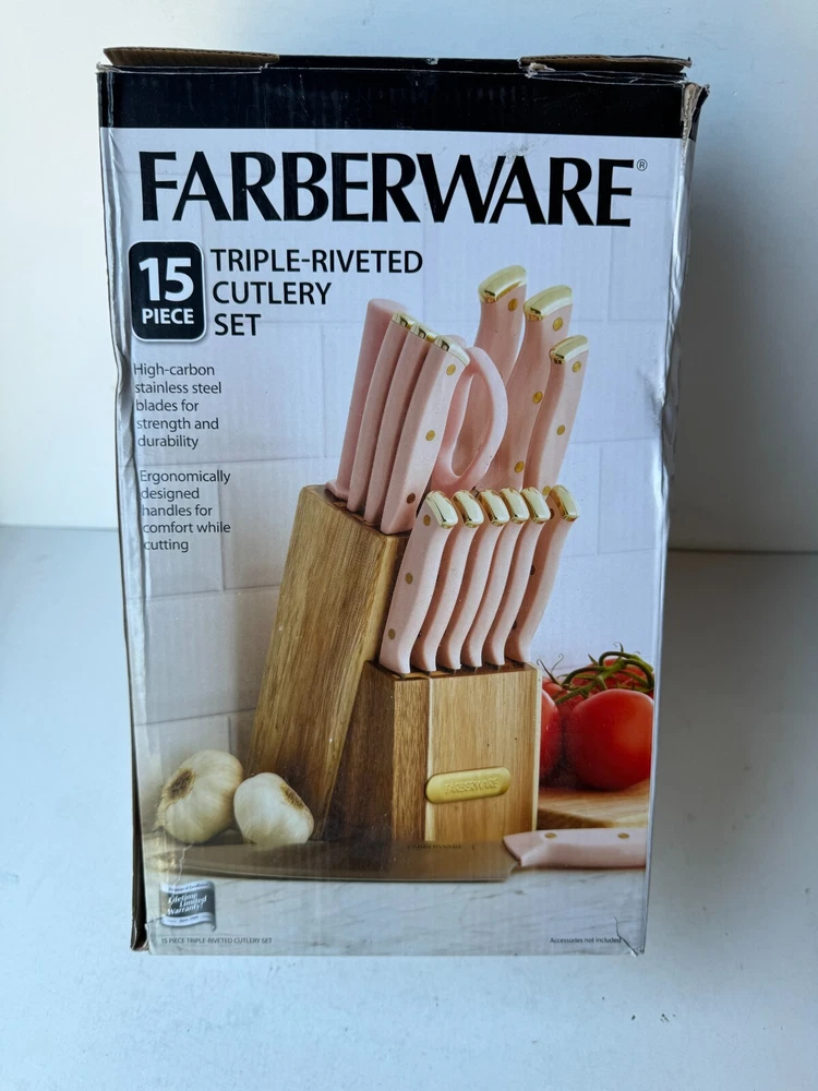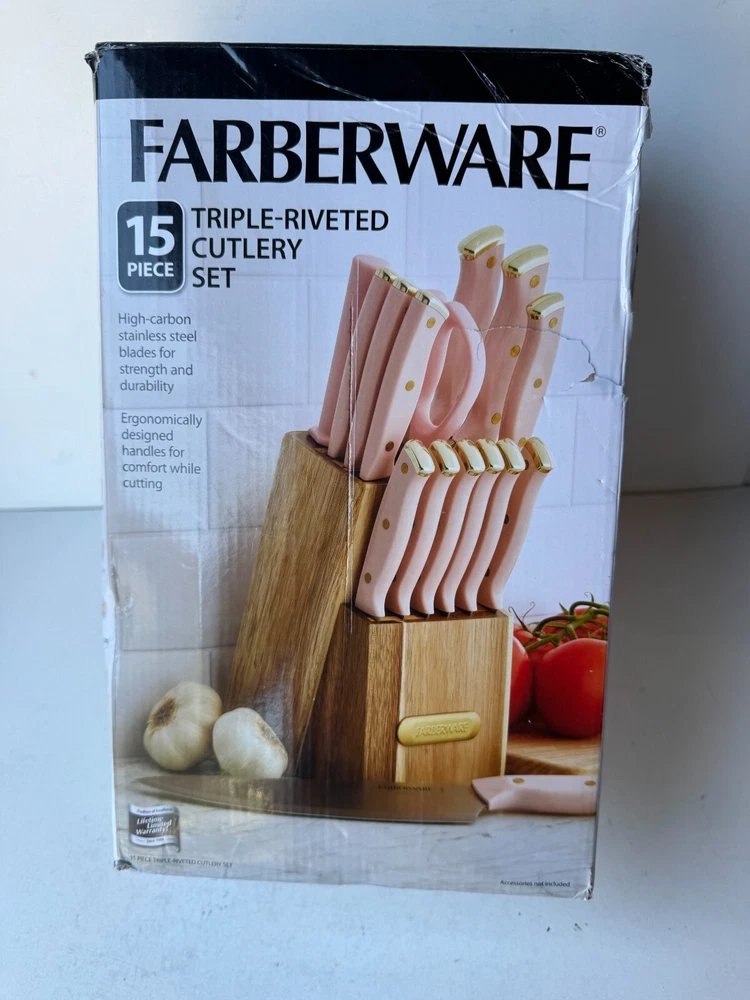 Farberware Triple Riveted Cutlery Knife Block Set Stainless Steel (15-Piece) Description Farberware Triple Riveted Cutlery Knife Block Set Stainless Steel (15-Piece). Product Detail • Brand : Farberware • Blade Material : Stainless Steel • Blade Color : Silver • Type : Cutlery Knife Block Set Please message me if you have any questions.