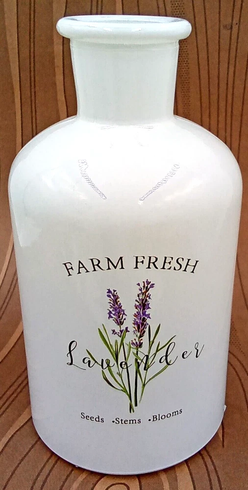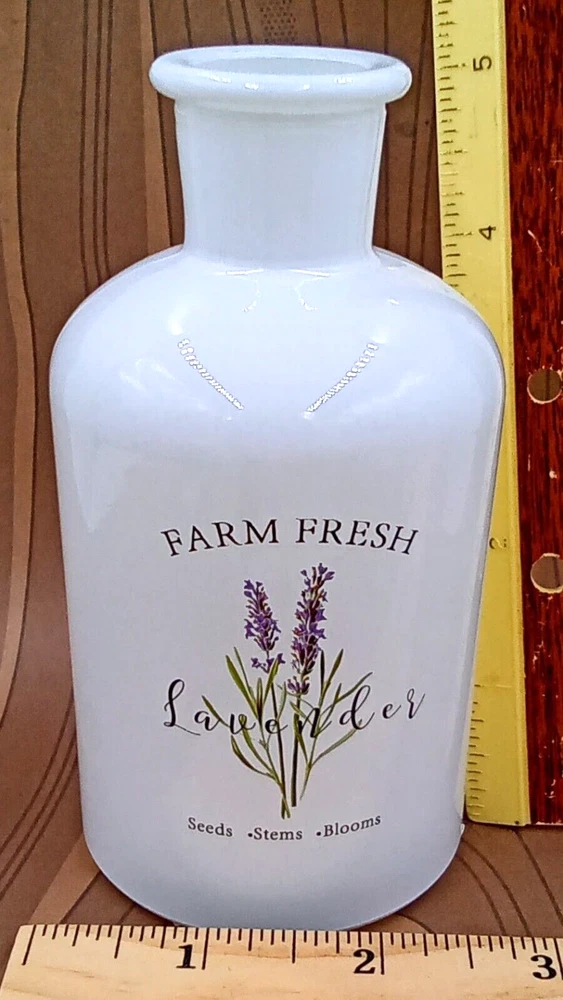 Farm Fresh Lavender Bottle Vase White Glass Floral Seeds Blooms Stems Sprigs 5"
