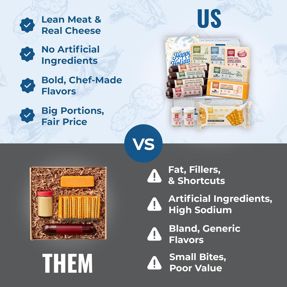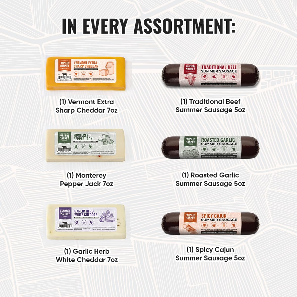 All Natural Summer Sausage: Made the traditional way, each sausage is slow-smoked over hickory wood for rich, hearty taste. No shortcuts—just real meat, natural spices, and time-tested techniques. Perfect for Gifting & Grazing: Includes an assortment of boldly seasoned summer sausage and cheese, crackers, and spreads for a charcuterie board that steals the show. Clean Ingredients, Honest Food: Crafted in small batches with high quality cuts of meat and all-natural seasonings. Low sugar, lower sodium, free from MSG, nitrates, nitrites, and artificial preservatives—just pure, satisfying flavor. A Perfect Holiday Gift for Food Lovers: This thoughtfully curated charcuterie collection is the perfect way to delight the foodies in your life—offering bold flavors, artisanal quality, and ready-to-enjoy convenience that make every celebration extra special. Ideal for Grazing & Gathering: Includes Traditional Beef 5oz, Roasted Garlic 5oz, and Spicy Cajun 5oz summer sausages—perfectly portioned for slicing and sharing. Pair with cheeses, crackers, and spreads for a classic charcuterie board. Great for family gatherings, holiday spreads, everyday snacks, or gifting someone a taste of Heartland culinary tradition. Product description All Natural Charcuterie Gifts Add to Cart Add to Cart Add to Cart Add to Cart Customer Reviews 4.3 out of 5 stars 2,067 4.3 out of 5 stars 2,067 4.3 out of 5 stars 2,067 4.3 out of 5 stars 2,067 4.3 out of 5 stars 2,067 4.3 out of 5 stars 2,067 3.9 out of 5 stars 165 Price $119.99 $ 119 . 99 $85.99 $ 85 . 99 $69.99 $ 69 . 99 $47.99 $ 47 . 99 $44.79 $ 44 . 79 $34.39 $ 34 . 39 $25.99 $ 25 . 99 Number of Items 19 14 14 10 7 6 4 Pounds of Charcuterie 8 6 5 4 3 2 1 No Artificial Preservatives ✔ ✔ ✔ ✔ ✔ ✔ ✔ High Protein ✔ ✔ ✔ ✔ ✔ ✔ ✔ Gluten Free ✔ ✔ ✔ ✔ ✔ ✔ ✔ Paleo & Keto ✔ ✔ ✔ ✔ ✔ ✔ ✔ Made in Wisconsin ✔ ✔ ✔ ✔ ✔ ✔ ✔