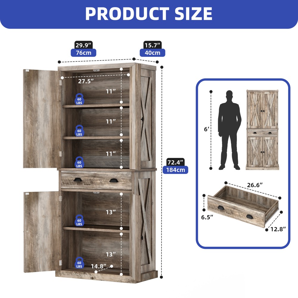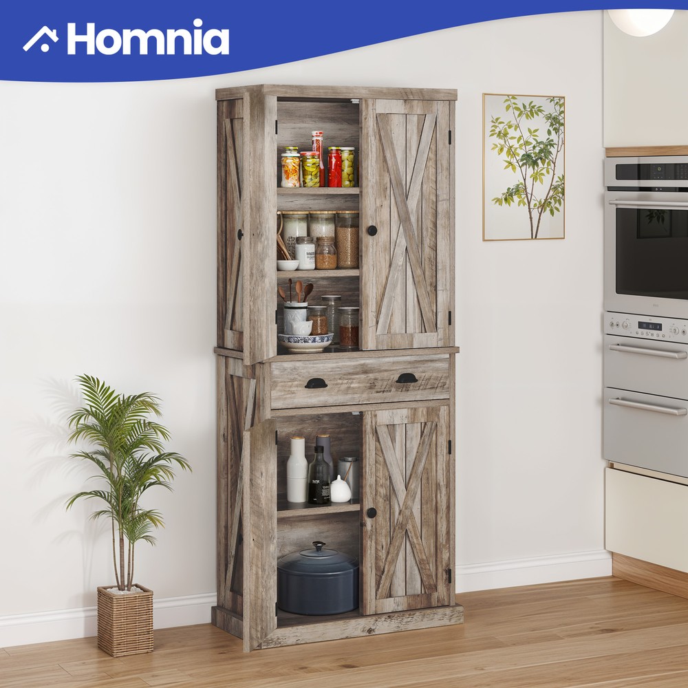 Room Placement:KitchenDoor Style:SlabDoors Included:YesProduct Care:Spot clean with a dry clothFire Resistant:YesNumber of Drawers:1Material:MDF/Chipboardgtin13:197839138247Handle Finish:PolishedWeight Capacity Each Shelves:60 PoundsItem Height:72.44'' inUPC:197839138247Shape:RectangularHandle Material:ChromeLoad Capacity:300 lbsStyle:FarmhouseAssembly Required:YesFeatures:Adjustable Shelves, Ball Bearing Slides, Embossed, Handles, With Doors, With Drawers, Magnetic Closure, Scratch Resistant, Soft Close DrawersNumber of Shelves:6Mounting:Free StandingNumber of Doors:4Color:Light Rustic OakCalifornia Prop 65 Warning:This product can expose you to chemicals including dehp, which are known to the State of California to cause cancer and birth defects or other reproductive harm.Drawers Included:YesMPN:BEYSH1KMg6Room:KitchenItem Weight:108.64 lbsShelves Included:YesBrand:HomniaItem Length:30'' inFinish:LaminatedFeature:ESCPBase Type:PedestalType:Pantry/Utility CabinetItem Width:15.55'' in