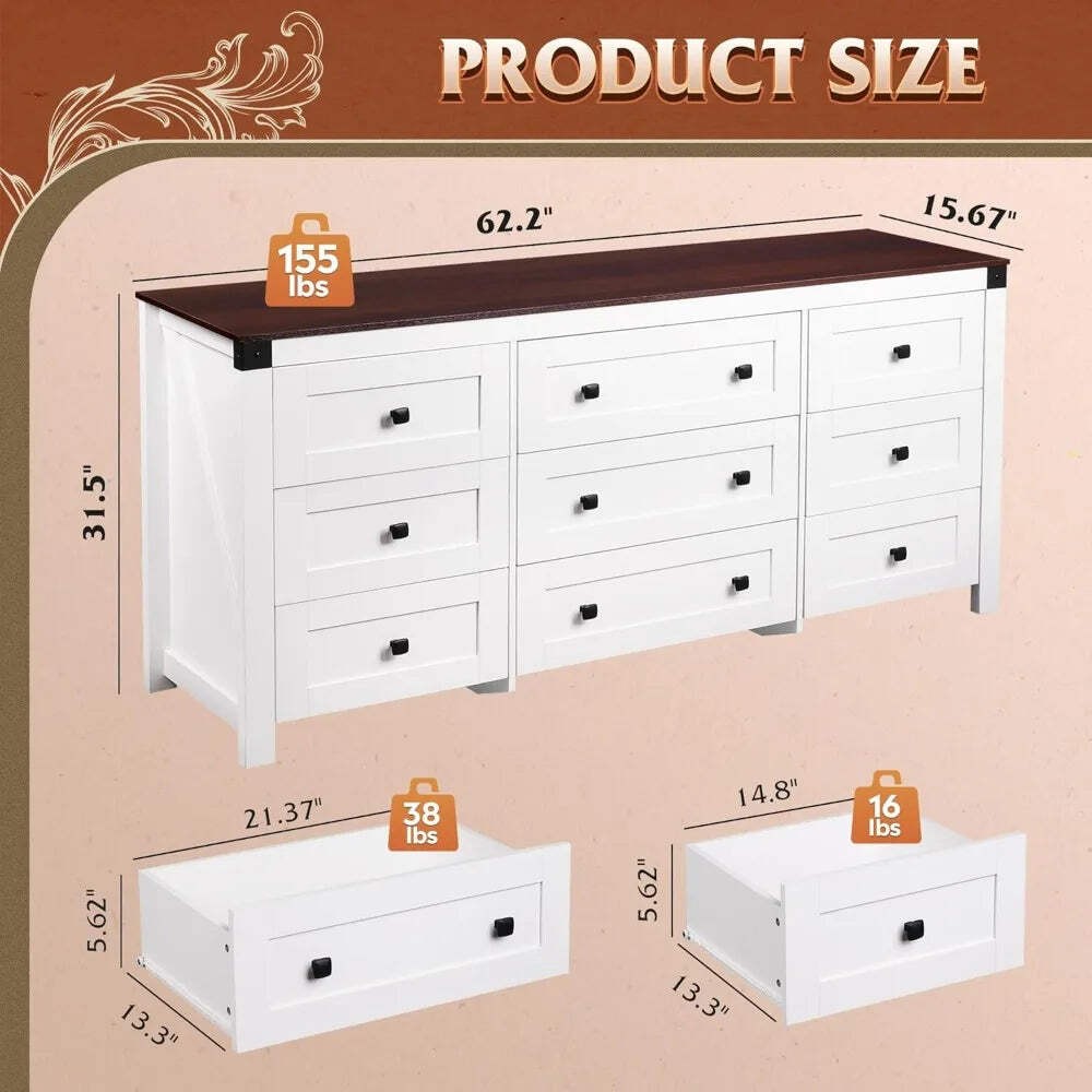 Farmhouse 9 Drawer Dresser Storage Organizer for Bedroom and TV Stand Transform Your Space with the Ljustra Farmhouse Dresser Introducing the Ljustra Farmhouse Dresser, a perfect blend of style and functionality for your bedroom or living area. This stunning 63" wide dresser features a charming white finish accented by a rustic brown wood top, making it a versatile addition to any décor. Key Features: Farmhouse Charm: The retro square handles and warm tones provide a cozy, inviting atmosphere. Ample Storage: Dimensions: 15.67"D x 62.2"W x 31.5"H. Includes six 13.31-inch depth x 14.8-inch width drawers and three 13.3-inch depth x 21.37-inch width drawers, perfect for organizing clothing and essentials. Sturdy Construction: Made from durable engineered wood with an anti-tipping device for safety. Each drawer holds up to 30lbs, while the wood top can support up to 130lbs, perfect for your TV and decorative items. Smooth Functionality: Equipped with smooth metal slides for easy access and stability. Easy Assembly: Comes with detailed instructions and pre-coded parts to ensure a quick and hassle-free setup. Elevate your home’s storage solutions with the Ljustra Farmhouse Dresser. Functional, safe, and stylish, it’s the ideal organizer for your bedroom or as a TV stand in your living room! Explore more from Ljustra Dresser Home Decor bedroom furniture Farmhouse 9 Drawer Dresser Storage Organizer for Bedroom and TV Stand Transform Your Space with the Ljustra Farmhouse Dresser Introducing the Ljustra Farmhouse Dresser , a perfect blend of style and functionality for your bedroom or living area. This stunning 63" wide dresser features a charming white finish accented by a rustic brown wood top, making it a versatile addition to any décor. Key Features: Farmhouse Charm: The retro square handles and warm tones provide a cozy, inviting atmosphere. Ample Storage: Dimensions: 15.67"D x 62.2"W x 31.5"H. Includes six 13.31-inch depth x 14.8-inch width drawers and three 13.3-inch depth x 21.37-inch width drawers, perfect for organizing clothing and essentials. Sturdy Construction: Made from durable engineered wood with an anti-tipping device for safety. Each drawer holds up to 30lbs, while the wood top can support up to 130lbs, perfect for your TV and decorative items. Smooth Functionality: Equipped with smooth metal slides for easy access and stability. Easy Assembly: Comes with detailed instructions and pre-coded parts to ensure a quick and hassle-free setup. Elevate your home’s storage solutions with the Ljustra Farmhouse Dresser. Functional, safe, and stylish, it’s the ideal organizer for your bedroom or as a TV stand in your living room! Explore more from Ljustra Dresser Home Decor bedroom furniture × × × × × × × × Shipping info Click the Shipping & Payments tab above the listing description for more info FREE Shipping Click the Shipping & Payments tab above the listing description for more info! Additional delivery notes PICK UP OPTION Sorry, our items are NOT available for pick-up. PAYMENT Immediate payment is required upon selecting "Buy It Now" or upon checking out through the cart. We accept payment via U.S. PayPal accounts and all Major Credit Cards, Debit Cards & Google Pay. We are legally required to collect sales tax in those states and localities where we maintain a physical presence (nexus). The applicable amount of sales tax charged to an order will be calculated based on the shipment destination's state and local sales tax laws. Thank you for shopping with us on eBay! Additional Information No additional information at this time Ask seller a question You might also like Modern Black U-Shaped Corduroy Sectional Sofa w/ Chaise Lounges, 130" Wide Ljustra 104" L-Shape Modular Couch - Modern Comfy Upholstered Sectional Sofa for Luxurious 3 Piece Velvet Chesterfield Living Room Sofa Set Ljustra 110 Inch Sleeper Sofa Sectional Bed with Storage Chaise Contact To contact our Customer Service Team, simply click the button here and our Customer Service team will be happy to assist. Ask seller a question © My Store Shipping & Payments Shipping is FREE for this item Payment Accepted Payment Methods Immediate payment is required upon selecting "Buy It Now" or upon checking out through the cart. We accept payment via U.S. PayPal accounts and all Major Credit Cards, Debit Cards & Google Pay. We are legally required to collect sales tax in those states and localities where we maintain a physical presence (nexus). The applicable amount of sales tax charged to an order will be calculated based on the shipment destination's state and local sales tax laws. Thank you for shopping with us on eBay! Returns Returns are accepted Items must be returned within 14 days of the auction ending Buyer will pay for return shipping. eBay integration by