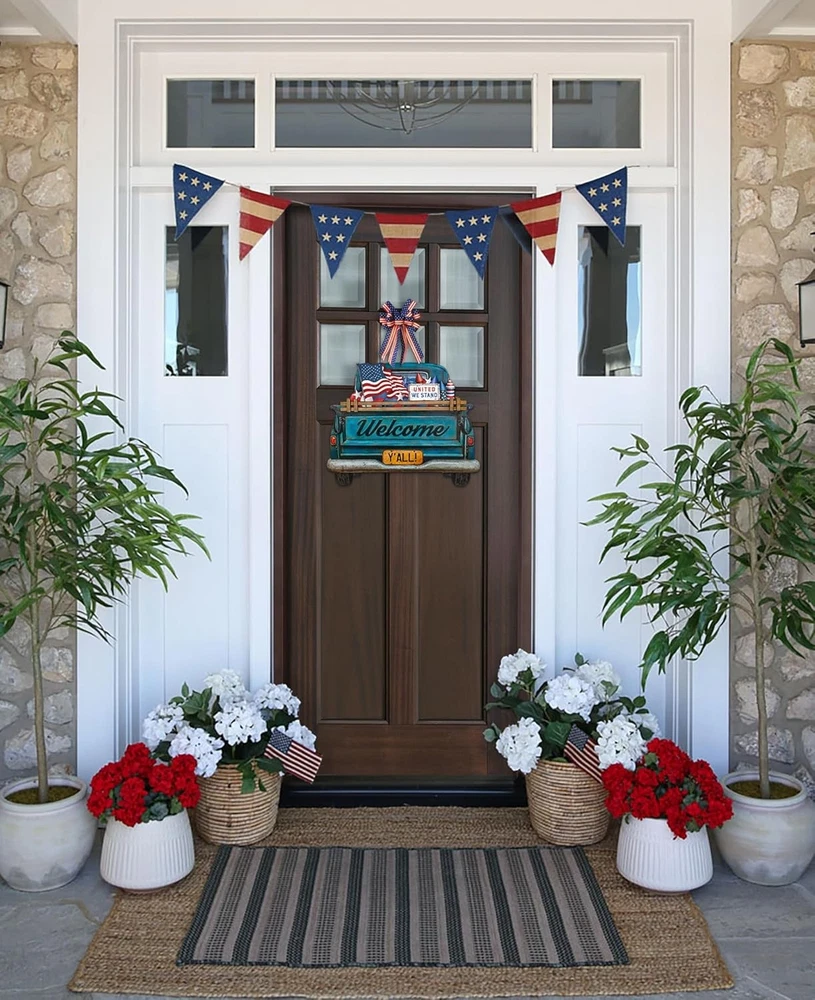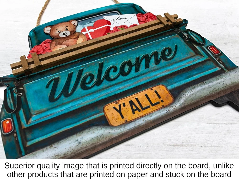 Interchangeable Welcome Sign for Front Door Blue Farmhouse Truck Decor Multi Product Details Product Dimensions: 15"L x 12"W Shape: Rectangular Style: Blue Farmhouse Truck Pre-printed: Welcome Item Thickness: 0.25 Inches Included Components: Interchangeable Seasonal and Holiday Decor Signs Item Weight: 2.81 pounds Manufacturer: Parallel Decor Country of Origin: China Item model number: 0 Color: Multi Brand: Parallel Decor Material: Engineered Wood Theme: farmhouse Mounting Type: Door Mount CHANGE YOUR FRONT DOOR DECOR ALL YEAR ROUND Our interchangeable home sign for your front door or porch comes with 11 unique interchangeable seasonal and holiday signs for Spring, Summer, Fall, Winter, Christmas, Thanksgiving, Easter, 4th of July, Halloween, Valentine’s & St Patrick’s day. Our seasonal welcome signs are not only beautiful to look at but are also versatile and easy to use. Change your front door decor instantly by swapping the seasonal decor sign on the truck. The truck has a hidden pocket slot behind the wood guard rail to hold it firmly in place. MATERIALS AND SIZE Suitable for most front doors, our interchangeable door sign measures 14” wide & 12” high (18” including the rope height) The design is UV printed in high resolution on a sturdy 1/4” thick MDF board so it's waterproof and will not warp or fade easily. The sturdy jute rope gives it a rustic farmhouse feel. The back side is finished with a clean black coating and foam pads to protect it from scraping your door. ARRIVES READY TO HANG Our welcome sign arrives at your door ready to be hung. Simply choose the appropriate design for the season, slip it into the slot behind the wood rail and it’s ready to hang on your door. A PERFECT GIFT FOR LOVERS OF FARMHOUSE DECOR Our seasonal welcome sign decoration is an ideal gift to give or receive for any occasion including Christmas, Housewarmings, Birthdays and Mother’s day.
