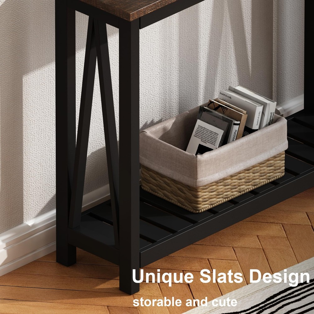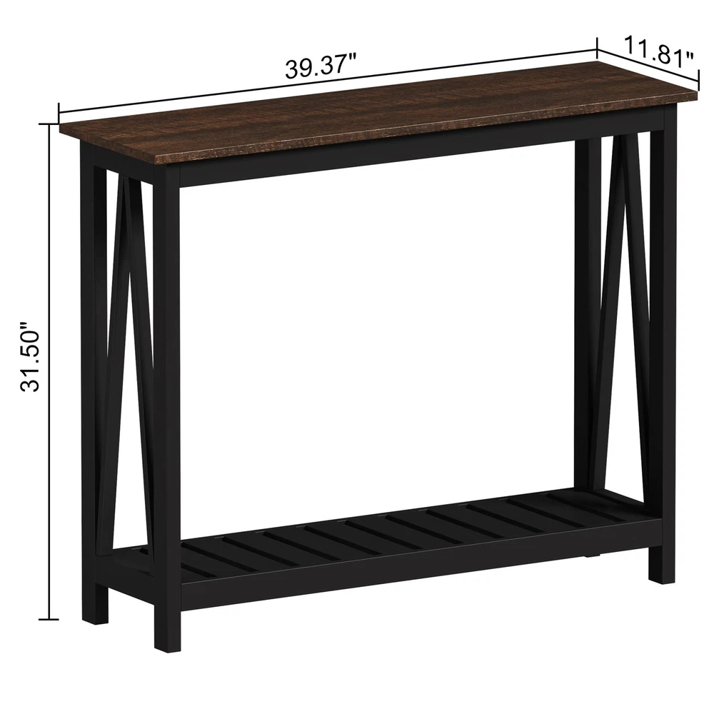 Product Description: represents a combination of functionality, durability and Robust, durable, quality simple, stylish design. The console table Provides you with a clean countertop and storage space. A-Design on sides and decorative slatted bottom shelf to enhance your home. Durability Materials foyer table is made of premium P2 MDF, which can be hold up wonderfully for years. Melamine veneer top is waterproof, heat-resistant and dust free, you just need a damp cloth to keep it clean. Decorative Slatted Bottom Shelf Decorative slatted bottom shelf produce a sense of concise and and beauty while provide provides a extra storage space. Wide Applicability Appropriate size makes this console table perfect for living room, bedroom,dining room, study, balcony, office, hallways and so on. Guide For Assembly Detailed instructions and simple steps enable you to assemble in less than 20 minutes. And we provide free after-sales service. Specifications Material: MDF Color: White/Black Dimensions: 39.37”(L) x 11.81”(W) x 31.5”(H) Net weight: 24.25 lbs Gross weight: 28.99 lbs Assembly required: Yes Assembly time: 0.5 hour 【High Quality】The console table is made of premium P2 MDF, and the top is melamine veneer, waterproof, heat-resistant, and dust-free, you just need a damp cloth to keep it clean 【Stylish Design】A-Design on sides to enhance your home. The decorative slatted bottom shelf and the melamine veneer top produce a sense of conciseness and beauty 【Wide Applicability】It's can be used as a console table, sofa table, side table, foyer table, or hallway table, It provides you with a clean countertop and storage space 【Easy Assembly】It only takes a few steps to complete the assembly, within 20 minutes, you can get the lovely console table 【Customer Service】If you have any questions, please contact us. We will solve the after-sales problem for you in time