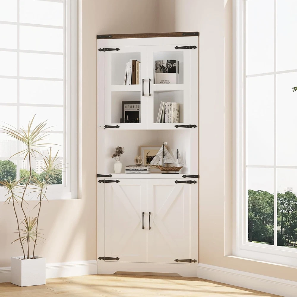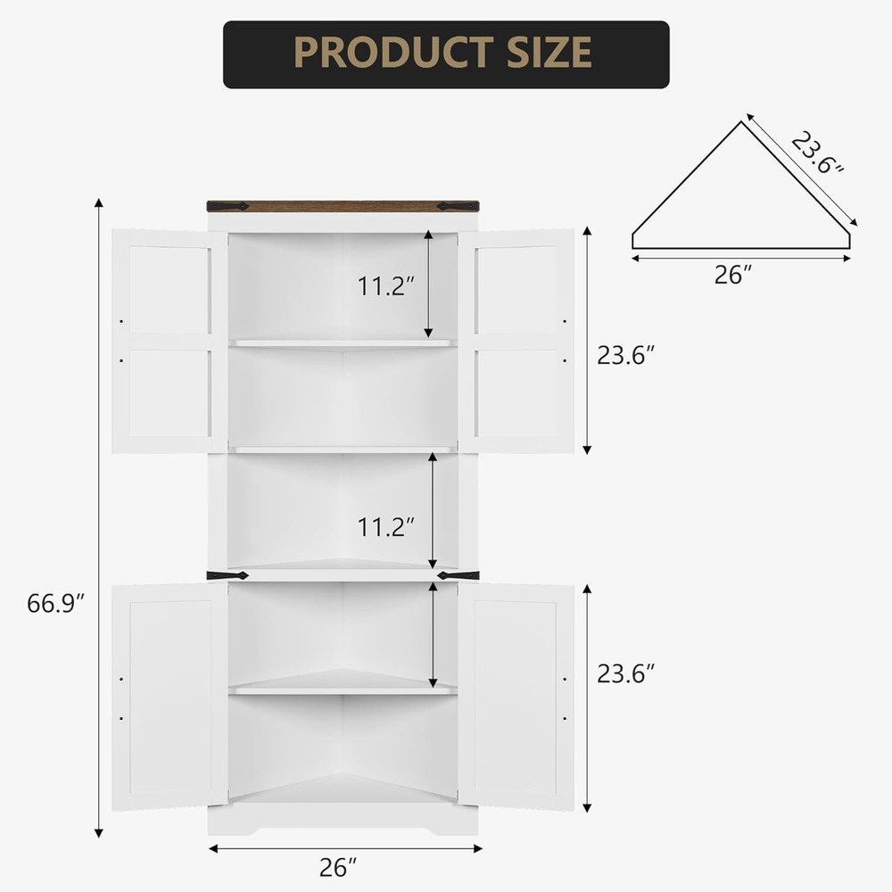 Product Description About this item 【Ample Storage Space】Our corner cabinet features adjustable concealed storage shelves at the top and bottom, providing customizable height options to accommodate your specific storage needs, offering ample storage space 【Maximized Storage Capacity】corner cabinet-Measuring 23.6"D x 26"W x 66.9"H, the corner storage cabinet offers ample storage with top and bottom cabinets and a spacious open compartment. Utilize vertical space effectively to meet your diverse storage needs in any room 【Stability and Security】The 90° right-angle design allows corner cabinet with doors to be installed flush between the corners of two walls. Equipped with a sturdy base and anti-tipper, the anti-tipper is attached directly to the wall to prevent tipping and maximise safety and stability 【Waterproof Material】Our Bathroom corner cabinet are treated with a waterproof finish and rustproof coating, making them resilient in any indoor environment. Their easy-to-clean design allows for use in wet areas, making them an ideal long-term storage solution for bathrooms or kitchens 【Easy Assembly】With clear instructions and all necessary hardware included, assembling this cabinet is quick and easy, so you can enjoy your new storage space right away. If you have any questions, our customer service team is here to help 📦 Maximized Storage Capacity 23.6"D x 26"W x 66.9"H design with top/bottom cabinets + open compartment Utilizes vertical space for kitchenware, linens, or decor in any room Ideal for maximizing storage in dining areas, kitchens, or bathrooms 🏡 Charming Farmhouse Aesthetic Rustic barn doors blend charming rustic style with modern homes Quality metal handles & trim complement stylish glass display doors Enhances dining rooms, kitchens, or bathrooms with timeless elegance 🔧 Versatile Adjustable Shelves Customizable interior shelves adapt to various item sizes Tailor height for kitchenware, decorative pieces, or bathroom essentials Ensures efficient space use for the ultimate storage flexibility 🛡️ Sturdy & Safe Design Snug corner fit with robust base and anti-tipping device Anti-tipper attaches to wall for added stability in active households Enjoy peace of mind with secure, safe storage for your belongings ⚙️ Effortless Assembly All tools & accessories included with easy-to-follow instructions Quick setup without complicated processes or extra tools Our customer service team is ready to help with any questions On Aug 13, 2025 at 23:53:55 PDT, seller added the following information: