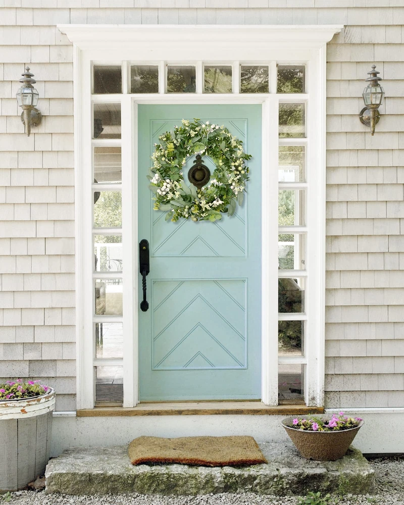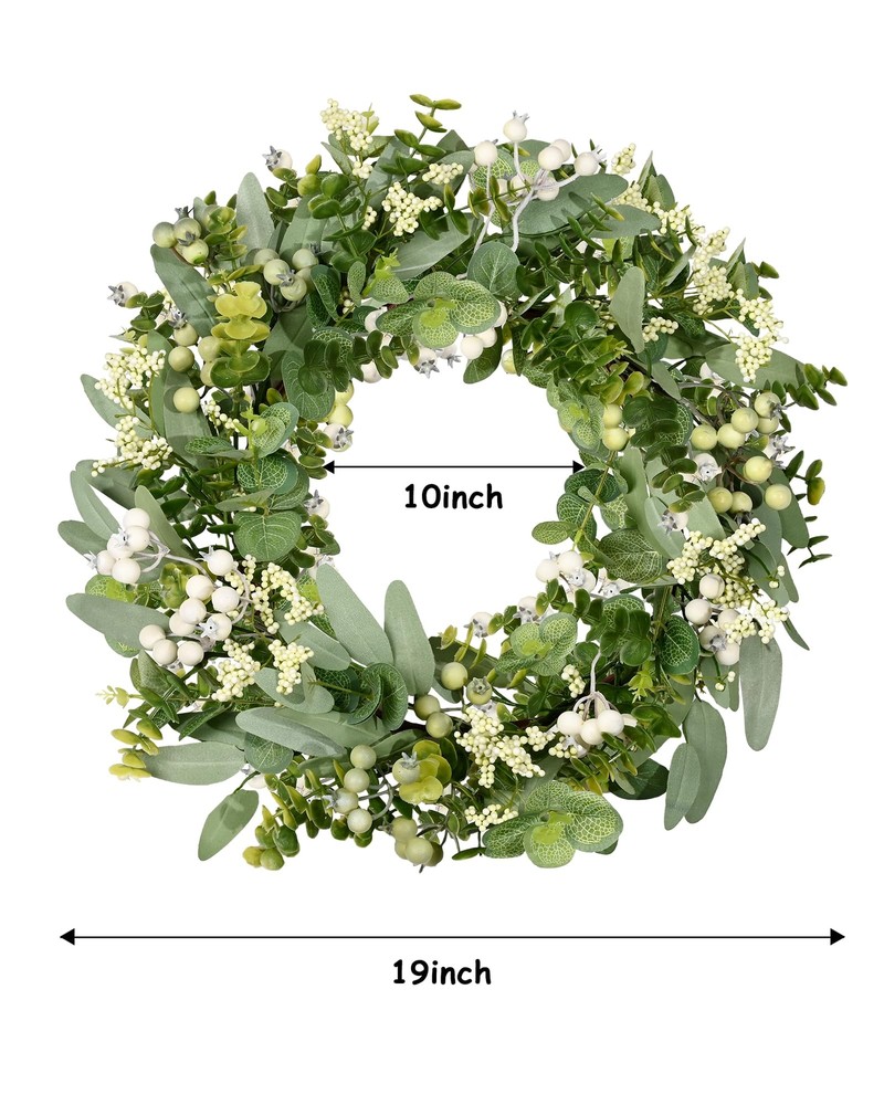 Features: 【All year round wreath】Available all year round:spring, summer, fall, and winter. Add themed decorations according to the festival, this is a flexible and versatile wreath. 【Full and realistic】Handmade green eucalyptus wreath features eucalyptus leaves, boxwood, white/green berries, andmany small berries embellishedon it, making the wreath full, natural and realistic. Its elegance add a vibrant and pleasant vibe to your home. 【Perfect Size】 This spring wreath is 19/20 inches in diameter. Each rustic farmhouse eucalyptus wreath is packed in a sturdy and exquisite box, suitable as a gift for friends. Note that because the wreath is compressed by the box to avoid being damaged during delivery, please fully stretch it to reach its maximum size. 【Versatile】This gorgeous wreath is a versatile decoration. It is suitable for all seasons of the year, spring, summer, fall and winter. You can add elements from each season, such as bells and pinecones, to turn it into a Christmas wreath. When you design it yourself, you will find that your wreath is the most unique scenery. It can be hung on the wall, front door, porch, bedroom, living room, etc. It is perfect for indoor and outdoor, weddings and parties. It's elegance is sure to impress your family and friends. 【Durable】Made of high-quality materials. Colors will never fade; leaves will never fall; berries will never rot. No watering and special cleaning required. Can be used for years to come. 【Christmas Wreaths】This eucalyptus wreath with berries can be turned into a Christmas wreath by tying a red bow, pairing it with pinecones, bells, and some red berries. It will stay with you all winter long. Specifications: Color - Green Material - Artificial Greenery Mounting Type - Door Mount Shape - Round Product Dimensions - 19"D x 19"W x 4"H//20"D x 20"W x 4"H Special Feature - Handmade, High-quality Materials, Long-lasting, Indoor/Outdoor Use Package List: 1PC