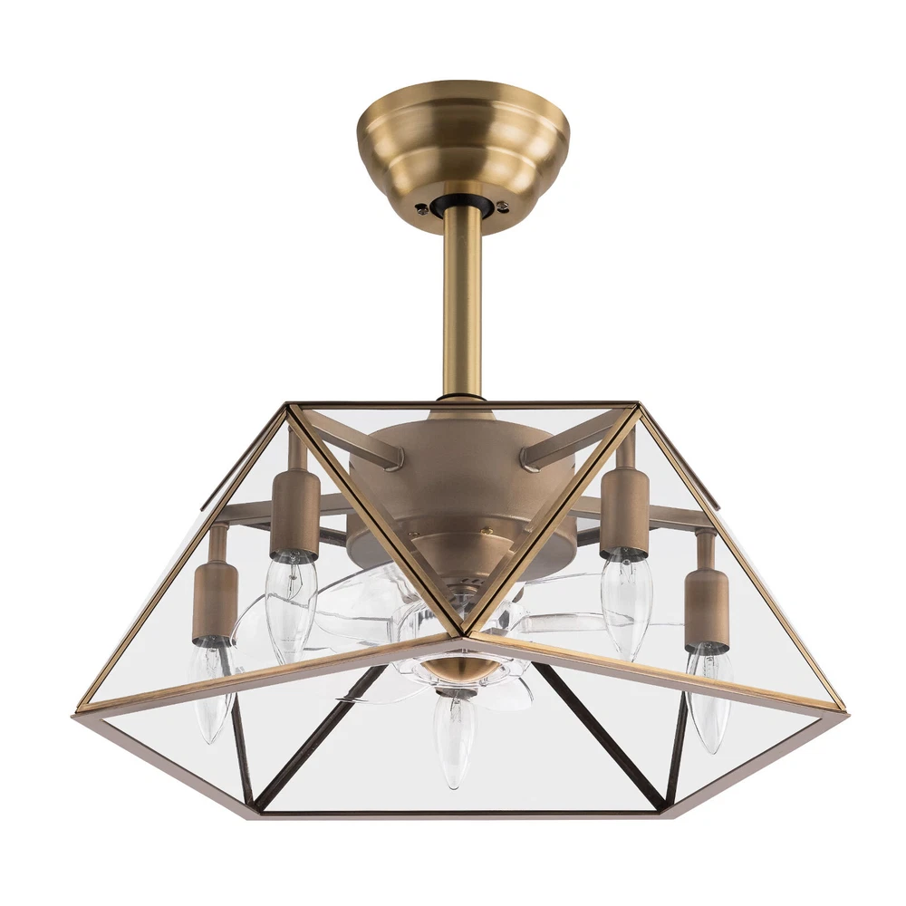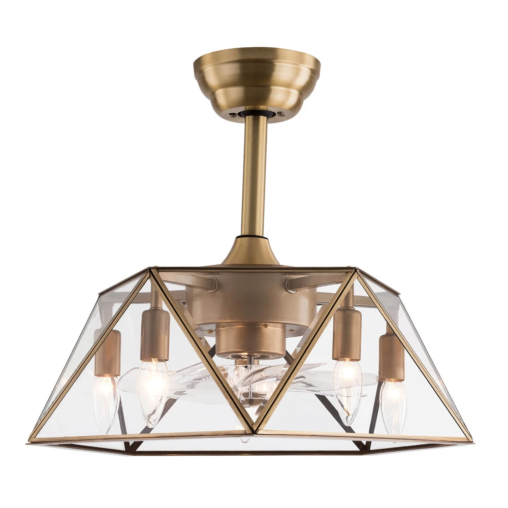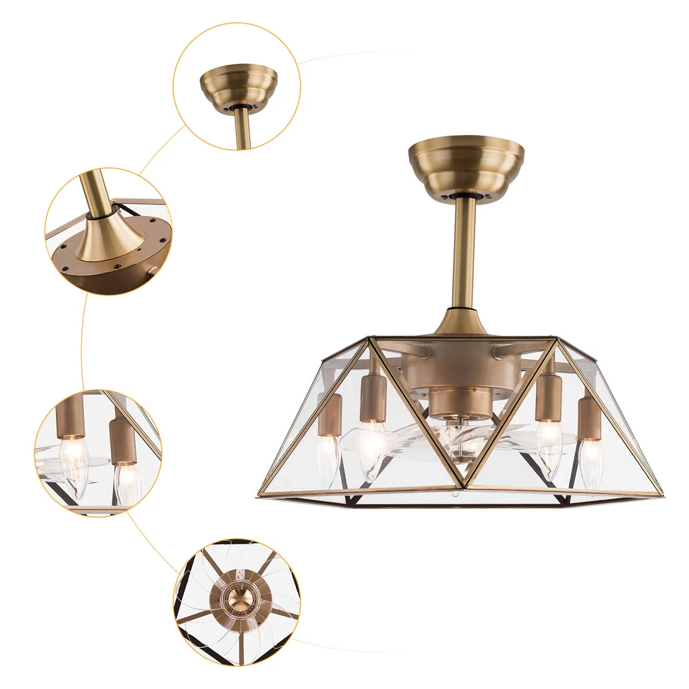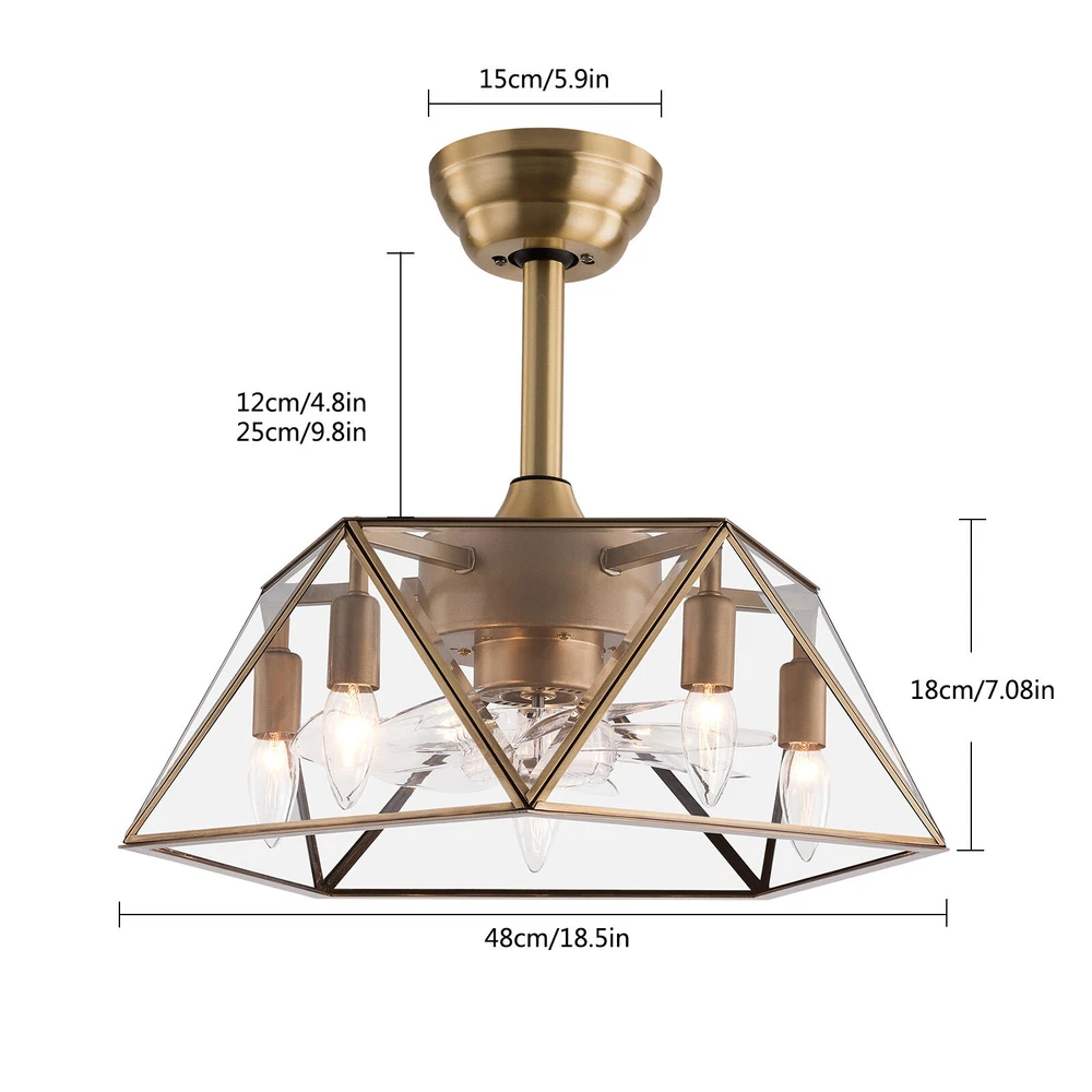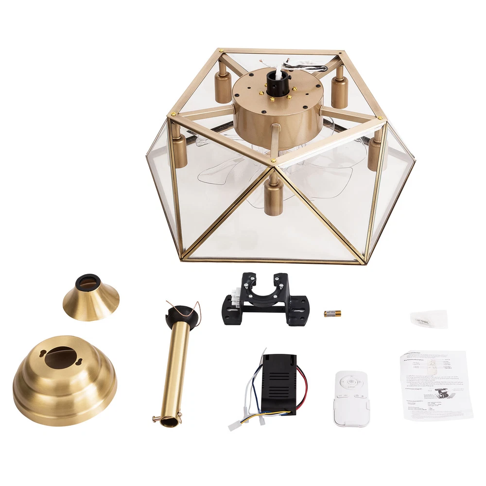 Description This 2-in-1 ceiling fan light allows you to feel the bright light and enjoy the coolness at the same time. It has six gears of wind speeds with a timing function to meet your daily usage needs. It can be integrated with different decoration styles and is ideal to create an excellent life and sleep environment to accompany you in all seasons. Key Features Stylish Exterior: The cylindrical lampshade, retro color scheme (Gold), and delicate lines make it very luxurious, and the water ripples on the tempered glass look like a flowing lake. It can be a good decorative piece to blend in with different decor styles and add color to your room. Great Durability: The lampshade is made of high-quality copper with a soldering process and tempered glass with high transparency, w Industrial Caged Ceiling Fan W/ Lights Farmhouse Ceiling Fan With Remote &Timing Description This 2-in-1 ceiling fan light allows you to feel the bright light and enjoy the coolness at the same time. It has six gears of wind speeds with a timing function to meet your daily usage needs. It can be integrated with different decoration styles and is ideal to create an excellent life and sleep environment to accompany you in all seasons. Key Features Stylish Exterior: The cylindrical lampshade, retro color scheme (Gold), and delicate lines make it very luxurious, and the water ripples on the tempered glass look like a flowing lake. It can be a good decorative piece to blend in with different decor styles and add color to your room. Great Durability : The lampshade is made of high-quality copper with a s oldering process and tempered glass with high transparency, which is heat-resistant , strong, durable, and not easy to deform. The fan blades are made of ABS, which has high strength, good toughness, and good formability, which can ensure a smooth surface and good gloss. High Safety: It is enclosed with 7 ABS blades hidden in the cage to avoid an accident caused by getting involved in the blades, so it's much safer than traditional fans to protect your family away from the fan blade's danger. 2-in-1 Function: The ceiling fan light has the function of fanning and lighting. It can not only illuminate you but also reduce heat, which can save you a lot of space. Adjustable Speed&Working Time: It has 6 gears of wind speed and you can choose low speed to enjoy the comfortable breeze or high speed to cool down quickly. Meanwhile, You can control its working hours in advance (1/2/4 hour), which can bring you great convenience. Easy to Clean : The smooth and flat shell, as well as the detachable fan blades, make this product easy to clean. You only need to clean it with a dry cloth, saving you lots of time and effort. Details Remote Control: It allows you to remotely control the timing, wind speed, etc, saving you lots of effort. Down Rods: This product is equipped with two down-rods with different lengths for different ceiling heights. Pure Copper Motor: It has stable performance, low-temperature rise, and low noise(About 40dB), providing a quiet working and sleeping environment. Meanwhile, there are a lot of heat dissipation holes on the motor shell, which can provide a good heat dissipation effect to ensure the stable operation and long service life of the motor. Application It is suitable for the living room, dining room, kitchen, study bedroom, small bedroom, conference room, and other places of 10-15㎡/107-161ft². Specifications Color: Gold Material: Copper, Tempered Glass, ABS Surface Treatment: Solder Process Style: Retro Motor Type: Pure Copper&Reversible Motor Number of Fan Blades: 7 Mounting Type: Ceiling Mount Rated Voltage: 85-265V Rated Power: 40W Power Source: DC Wind Speed Gears: 6 Timing: 1/2/4h Bulb Size: 5*E26/E27 (Not Included) Suitable Area: 10-15㎡/107-161ft² Electric Fan Design: Ceiling Fan Room Type: Bedroom, Living Room, Dining Room, Living Room, Kitchen Controller Type: Frequency Conversion Remote Control Efficiency: E Noise: About 40dB Base Diameter: 15cm/5.9inch Lampshade Size(L*H): 48*18cm/18.5*7.08inch Down-rod Length: 12cm/4.8inch, 25cm/9.8inch Package Included 1 * Ceiling Fan Light 1 *English Manual 1* Remote Control 1* 23A Battery All Accessories for Assembly Notes Please cut off the power supply when cleaning. The remote control is powered by a 23A battery (Included). Please note that the wall switch can only turn on the light or turn off the main power, and the ceiling fan can only be controlled by the remote control. This product does not include a light bulb. Please prepare five E26/E27 (Not Included) in advance. Please read the manual completely before installation and use, and pay particular attention to the safety instructions included. Please allow the slight color difference caused by the shooting light and 1-3cm error due to manual measurement, and make sure you do not mind before you order. Payment Delivery details Terms of sales About us Contact us Payment We accept ebay payment 。 Fees such as import duties, taxes are not included in the item price or shipping costs. These charges are the buyer's responsibility. Delivery details Shipping: 2-9 working days to: USA Terms of sales We maintain high standards of excellence and strive for hundred percent customer satisfaction. Feedback is very important to us. We hope that you contact us immediately before you give neutral or negative feedback, so that we can address your concerns. It is impossible to address issues if we do not know about them! About us Your satis faction is our ultimate goal. We work hard to earn your trust and future business. Our certified technicians have tested each item before shipping. The unit comes with 1 year limited warranty on all manufacturing defects. a) If you receive a defective item, you may return it or ask for a discount. Please contact us within 14 days after you receive the package. b) What you returned must be intact and in its original packaging as re? u. Customer is responsible for shipping co