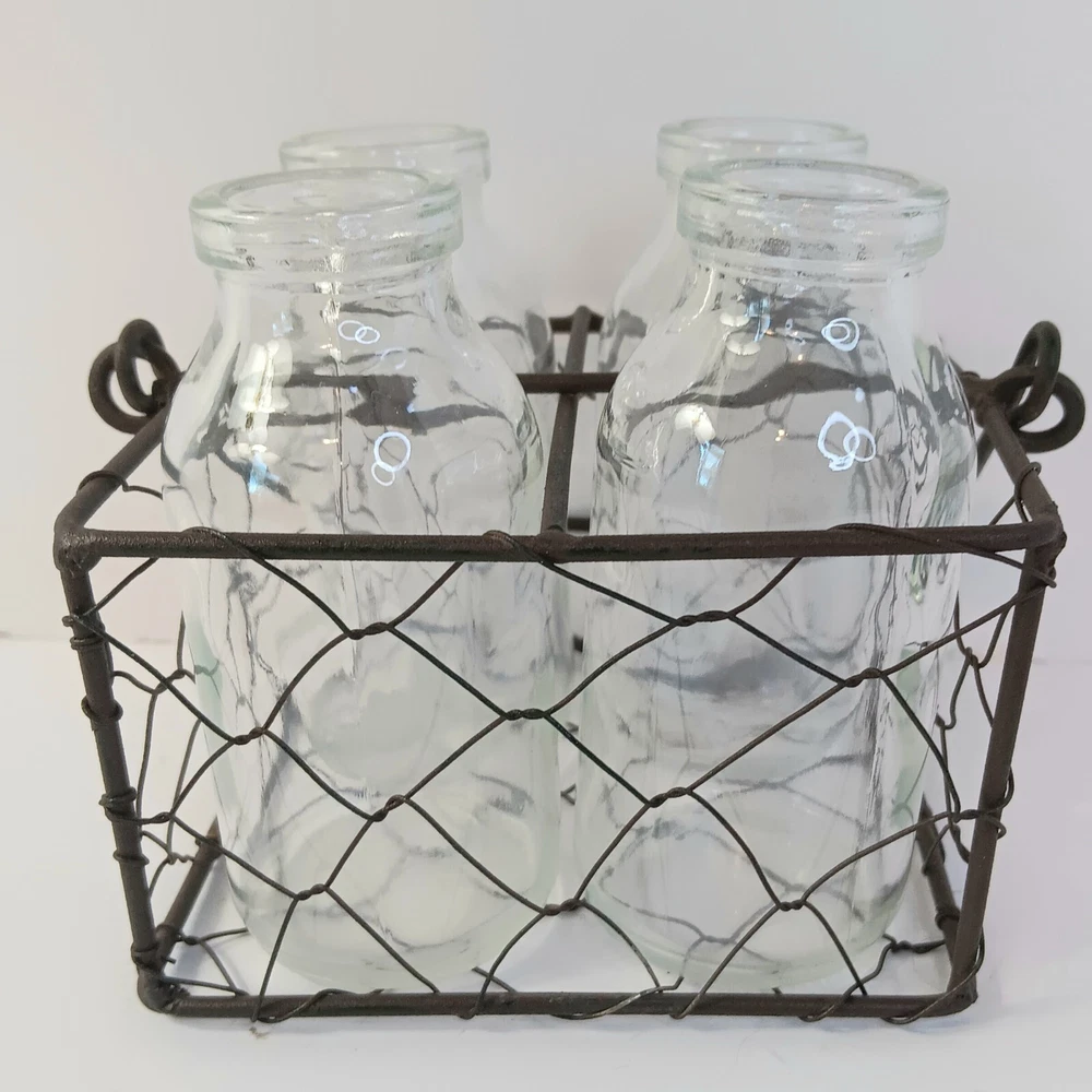 Farmhouse Metal Basket With Four Small Creamer Bottles Flower Vases Propagation Baset is approximately 5" Bottles are approximately 4" tall All Bottles and basket weigh approximately 1 lb Good condition. No chips or cracks. Bottles have a little cloudiness in the bottom and a little speck of debris in one bottle.