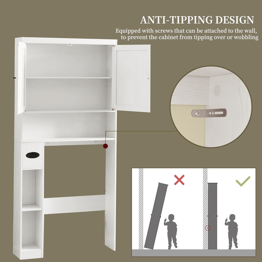 Product Description Over The Toilet Storage Cabinet, Farmhouse Storage Cabinet with 2 Barn Door Freestanding Space-Saving Bathroom Organizer with Adjustable Shelves & Toilet Paper Holder, for Bathroom, Restroom, Laundry About this item Rustic Double Barn Door Style – Classic farmhouse design with two barn doors adds warmth and character to any bathroom decor. Built-In Toilet Paper Holder – Convenient side-mounted toilet paper holder keeps essentials within easy reach and saves even more space. Space-Saving Over Toilet Cabinet – Turns unused wall space into practical storage for toiletries, extra rolls, and cleaning supplies. Strong & Stable Structure – Crafted from thick engineered wood for long-lasting durability, and designed to stay stable over your toilet. Fits Most Standard Toilets – Designed to fit above most toilets, perfect for apartments, homes, dorms, or small bathrooms.