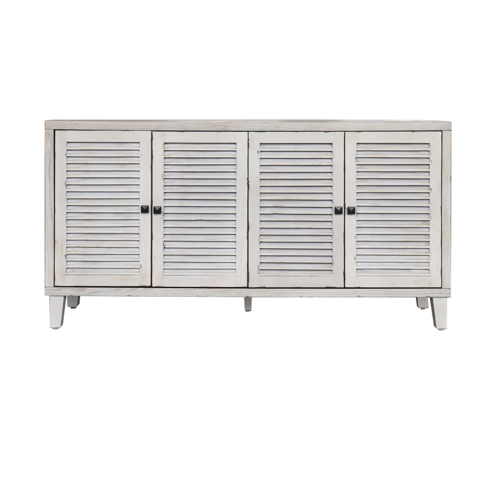 The "Accent Cabinet 4 Shutter Door Wooden Cabinet Sideboard Buffet Server Cabinet Storage Cabinet". This piece of furniture is more than just a storage solution, it's a statement piece that adds elegance and sophistication to your space.Key Features: Chic Design: The sideboard buffet cabinet features a shabby chic white wash finish, providing a touch of elegance to your space. The 4 shutter doors add aesthetic appeal and make it easy to find your belongings.High Quality: Made from high quality MDF and fir wood, this cabinet guarantees high stability and durability.Adjustable Shelves: The interior offers adjustable shelves that provide ample storage space for your belongings.Minimalistic Look: The cabinet hinges are fully concealed with euro-style hinges, maintaining its minimalistic Free Shipping Over $49.99* Details Farmhouse Style Storage Accent Cabinet with 4 Shutter Door,Wooden Cabinet Product Description: The "Accent Cabinet 4 Shutter Door Wooden Cabinet Sideboard Buffet Server Cabinet Storage Cabinet". This piece of furniture is more than just a storage solution, it's a statement piece that adds elegance and sophistication to your space. Key Features: Chic DesignThe sideboard buffet cabinet features a shabby chic white wash finish, providing a touch of elegance to your space. The 4 shutter doors add aesthetic appeal and make it easy to find your belongings. High QualityMade from high quality MDF and fir wood, this cabinet guarantees high stability and durability. Adjustable ShelvesThe interior offers adjustable shelves that provide ample storage space for your belongings. Minimalistic LookThe cabinet hinges are fully concealed with euro-style hinges, maintaining its minimalistic look. Weight CapacityThe cabinet top can hold up to 80lbs, and the shelves can hold up to 25lbs each. Easy AssemblyThe simple design ensures easy assembly. All hardware and detailed instructions are provided, helping you complete the assembly as soon as possible. Experience style, elegance, and functionality with our Accent Cabinet 4 Shutter Door Wooden Cabinet Sideboard Buffet Server Cabinet Storage Cabinet. It's more than just a cabinet, it's a style statement.