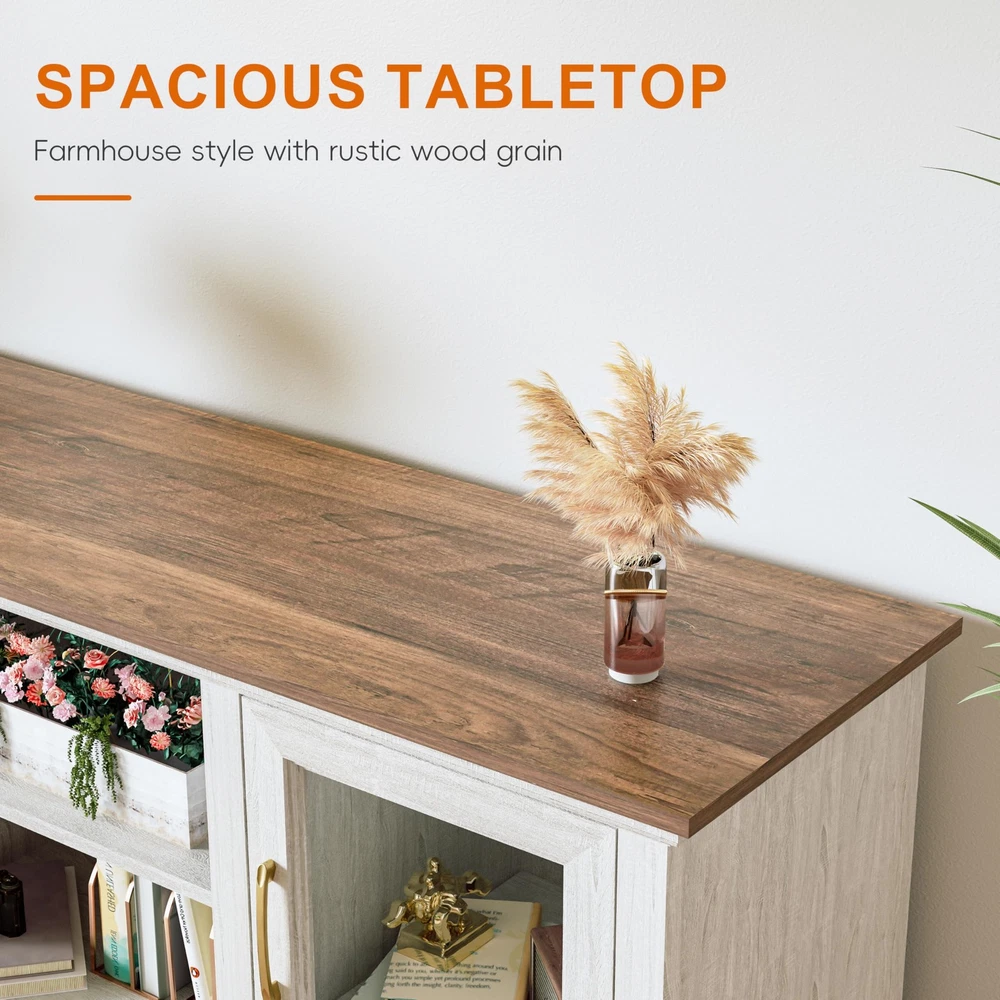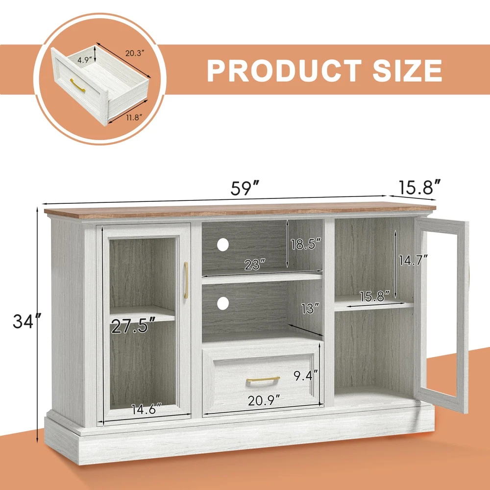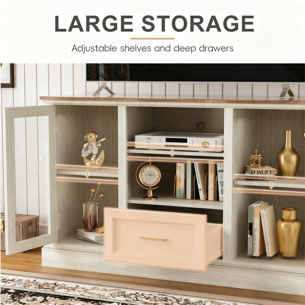 Farmhouse TV Stand for 55/60/65 Inch TV, Tall Media Console with 2 Glass Doors & 3 Adjustable Shelves, Wood Entertainment Center with Cubbies & Drawers for Living Room, Rustic White About this item 1、Timeless Farmhouse Charm: The TV stand showcases a classic farmhouse suitable with a beautifully textured wood grain finish, adding a warm and rustic charm to any living space. Perfectly complements other furniture in your home. Suitable for TVs up to 65 inches. 2、Ample Storage with Adjustable Shelves: Featuring a spacious cabinet with tempered glass doors and adjustable shelves, this TV console offers versatile storage for media devices, decor, and more. Customize the shelf heights to fit your needs. 3、Easy Cable Management: Keep your entertainment space neat and organized with the built-in cable management holes on the back panels. The 2" diameter openings allow for easy routing of cables, maintaining a clutter-free environment. 4、Durable Construction for Long-Lasting Use: Crafted from high-quality MDF with a reinforced structure, this TV cabinet ensures stability and durability. The 1.57" thick top panel and sturdy base support up to 150 lbs, making this media console perfect for holding your TV and other items securely. 5、Easy Assembly and Secure Packaging: Comes with clear, step-by-step instructions and all necessary hardware labeled for easy assembly. Secure packaging with protective foam and boards ensures your TV stand arrives in perfect condition. Free Shipping to Most US area! Please note that Certain automotive parts may be subject to regulatory restrictions in the state of California (CA), which can prevent us from shipping these items to addresses within CA. Destinations including Puerto Rico (PR), U.S. Virgin Islands (VI), Guam (GU), Northern Mariana Islands (MP), (AS) , (AK) ... are considered U.S. territories but may be subject to extended delivery timelines and additional shipping fees due to their remote locations. We encourage customers placing orders to these areas to contact us prior to completing your purchase, so we can confirm shipping availability and any potential surcharges. Thank you for your understanding. On Feb 5, 2026 at 08:24:20 PST, seller added the following information: