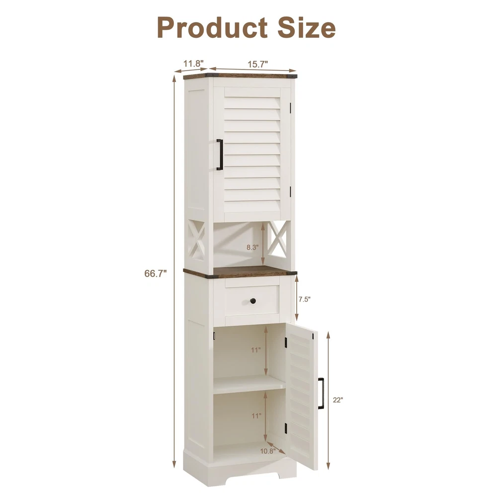 Farmhouse Storage Cabinet, Tall Bathroom Storage Cabinet with Door&Adjustable Shelves, Kitchen Cabinet with Storage, Tall Linen Cabinet Bathroom, Living Room ,Soft White 【Farmhouse Design】:The cabinet use warm whites and browns to create a farmhouse feel, and the farmhouse storage cabinet adds a touch of color to your space. cPaired with louvered doors, it enhances a sense of space 【Utilize Vertical Space】:The tall bathroom storage cabinet 16"D × 12"W × 67"H is ideal for narrow spaces, with multiple shelves and cabinets that make it easy to store various items, clearing clutter and keeping everything organized to maximize your space 【Multi-Function】: In addition to storing items in the bathroom orliving room, the cabinet is also a great choice for organizing in the kitchen where it will help declutter while adding a decorative touch to your space 【High-Quality】: The tall linen cabinet is made of high-quality MDF boards, it is long-lasting and could accompany you through the years. The thickened pillars enhance its load-bearing capacity and stabilit 【Simple Assembly & Quality Service】: The storage cabinet is easy to install, we come with detailed instructions and if you have any questions, we will provide you with customer service!