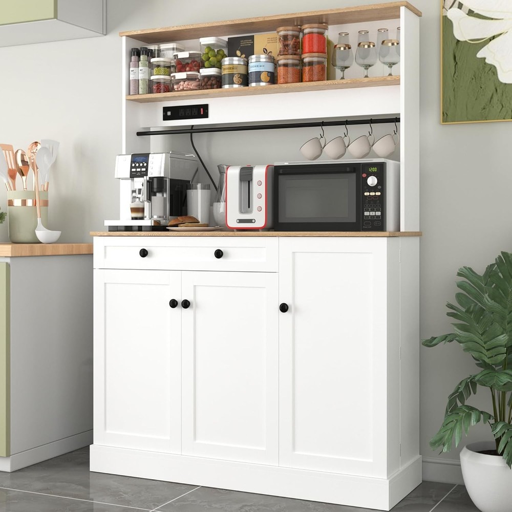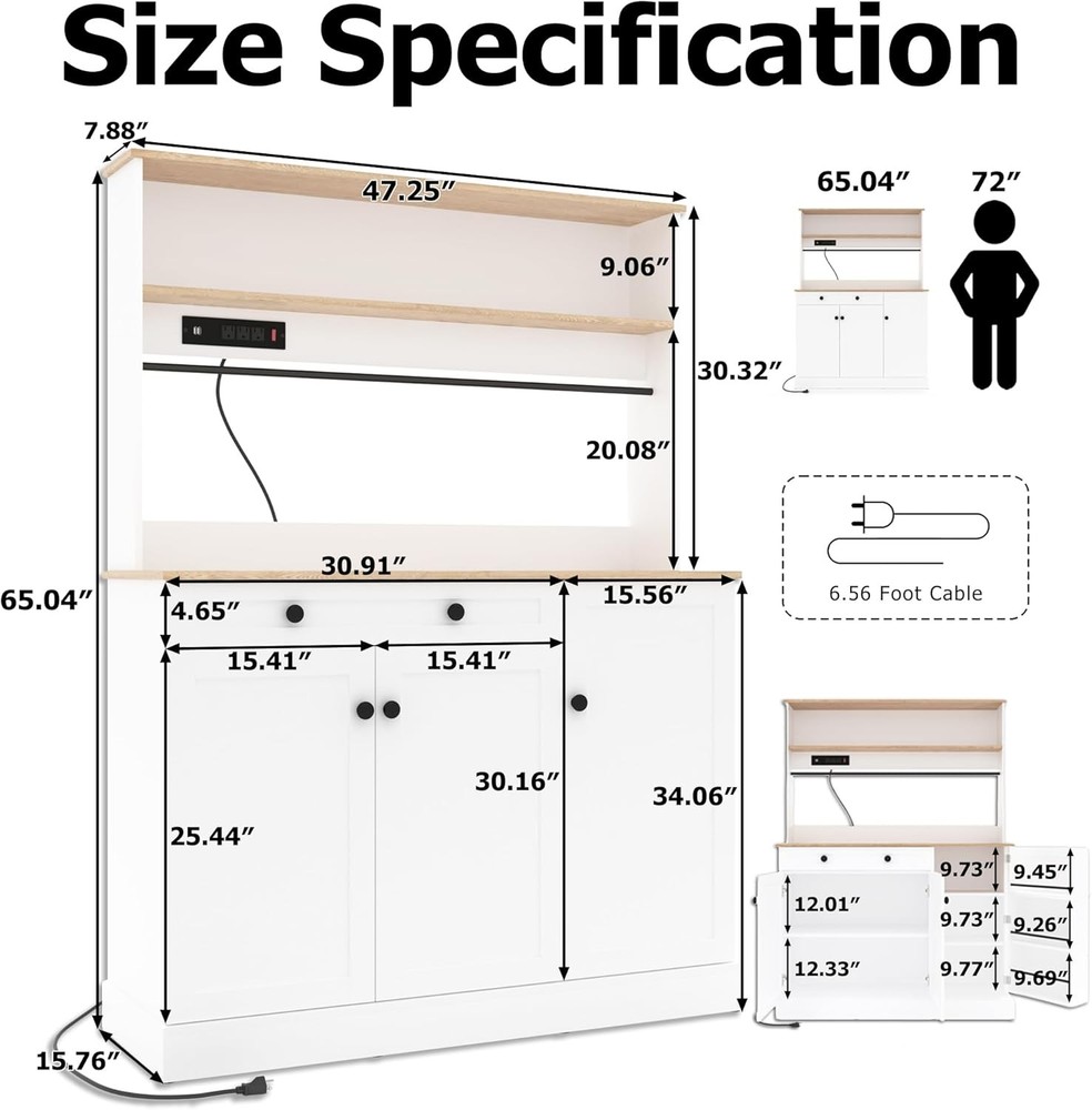 Product Description About this item 【Large Kitchen Pantry Cabinet】With generous size of 15.76" * 46.47" x 65.04", this kitchen hutch bar features large storage capacity designed into multiple open as a storage solution to help organize your space, perfectly solves the messy storage dilemma in your kitchen. 【Power Outlets】The kitchen pantry cabinet is equipped with 3 AC power outlets and 2 USB charging ports, which can power 5 devices at the same time. Your everyday household appliances can be powered on quickly, and the switch can easily and safely turn off the power without unplugging the appliance at any time. 【Ample Storage Space】This large kitchen cabinet has multiple shelves for displaying fine cutlery or storing food jars to keep everything organized, an open wine rod seamlessly integrates into the design, provides 5 hooks to easily hang your favorite wine glasses, coffee cups, etc., while showing their elegance, A spacious countertop allows for easy storage of a coffee maker and microwave for increased daily convenience, this pantry features 1 drawer and three enclosed storage compartments below, and the compartmented storage design of the storage cabinets provides ample storage space for easy access to commonly used items, maximizing convenience. 【Sturdy Structure】 Made of high-quality engineered wood and waterproof paint, the kitchen storage cabinets are designed for durability,The design of hollow arch at the bottom increases the function of moisture resistance,The low center of gravity and anti-tip design make this 65 "tall pantry cabinet very practical for the dining room, living room or bathroom, laundry room, etc.,this cabinet furniture can keep everything organized while enhancing the overall beauty of the room. 【Modern Farmhouse Style】The kitchen pantry cabinet captures the essence of modern farmhouse aesthetics, combining functionality and style. Its crisp white cabinet contrasts sharply with the rich dark yellow wooden countertops. Exuding modern aesthetics and classic retro charm,The classic barn door design adds unique aesthetic appeal, making it an eye-catching focal point in any kitchen or living area. 【Multi-purpose Cabinet】It can be a kitchen pantry cabinet because it has spacious countertops and plenty of storage space, it can also be a buffet cabinet in a dining room because it has a stylish look, large capacity storage drawers and cabinets, or a coffee bar cabinet and bar cabinet in a living room. 【Easy to Assemble】 This pantry storage cabinet is a package that includes all the necessary accessories and tools, with clear instructions, simple assembly, no additional tools required, if you have any questions about the kitchen cabinet, please feel free to contact us. Freestanding Kitchen Hutch Cabinet with Drawers and Adjustable Shelves 65" Kitchen Pantry Storage Cabinet with Power Outlets Previous page Next page Product Function Display Farmhouse Food Pantry Cabinets with Microwave Stand Specifications Pantry Cabinet Dimension: 15.76"D x 46.47"W x 65.04"H Product Weight: 55.5 lb Material: Engineered Wood Color: White+yellow Gift: Four hooks Assemble Require: Yes Package Include: 1*cabinet,1*power outlet, 3 *doors,1 *drawers,1 * User Manual, 1 * Installation Tool When can I ship this pantry cabinet after I purchase it? Our warehouse will arrange for the package to be shipped within 24 hours and transported through FedEx. We have multiple shipping warehouses in the United States, so you can receive your package quickly no matter which region you are in. What material is this pantry cabinet made of? Is it durable?Is it waterproof? Yes, Made of high-quality engineered wood and waterproof paint, the kitchen storage cabinets are designed for durability. Is It difficult and time-consuming to assemble? No, we will provide a product manual. And an assembly video will be provided on the product details page for reference. You can follow the steps in the manual to assemble it. Assembly by multiple people takes less time, making it faster. What if I encounter problems during the assembly process? If you have any questions about our products, you can directly write to us and we will answer and provide assistance to you as soon as possible.What material is this table and chair set made of? Is it durable?