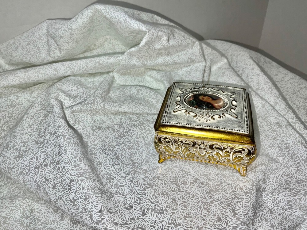 Farrington Japanese Jewelry Box, Metal Hinged Footed, Decorative Box, Cameo, with roses. Gold with white silver detailing. * Thank you for shopping with Becky