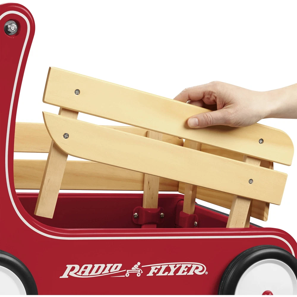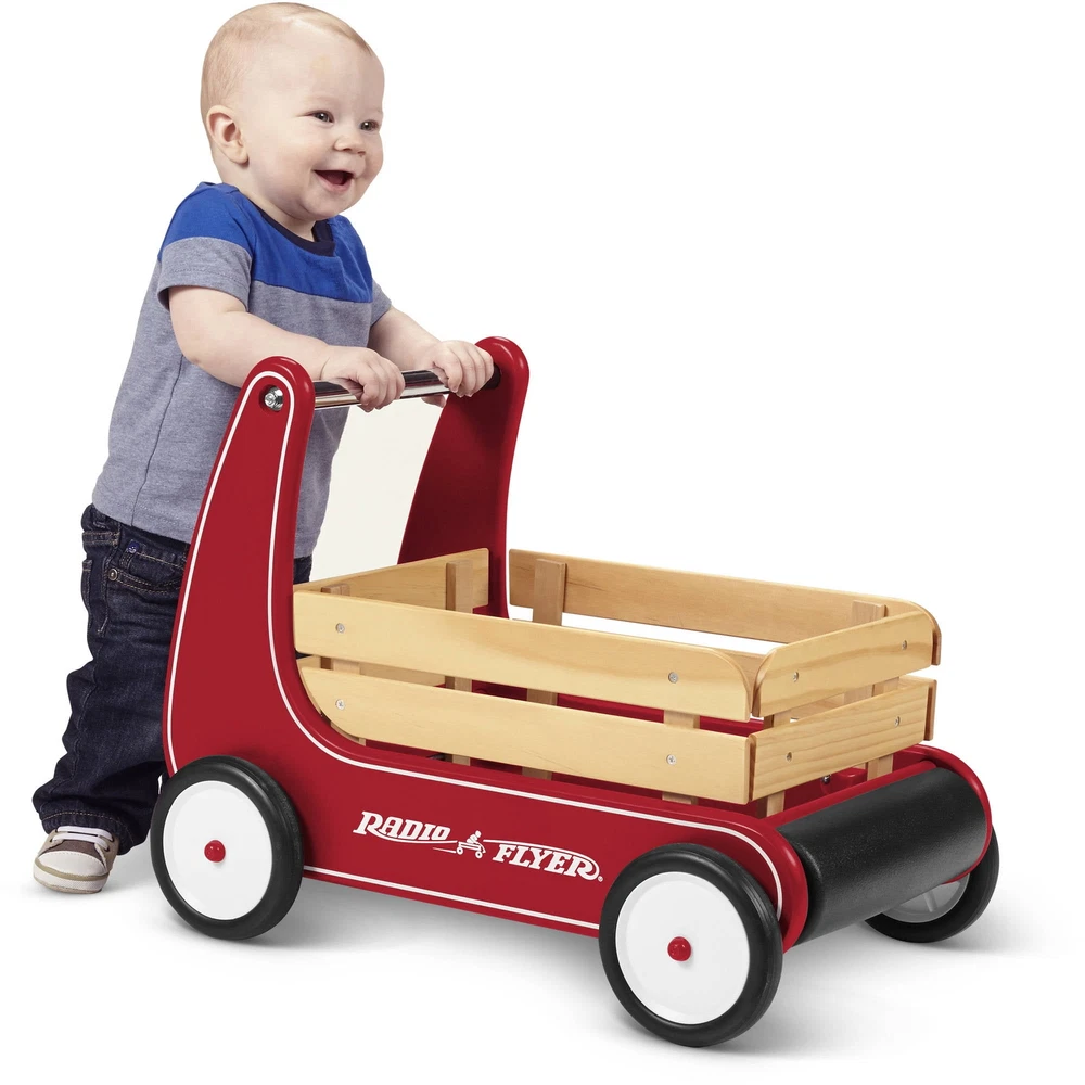Classic, safe and versatile, this award-winning push wagon is a favorite for children and parents alike. Radio Flyer's Classic Walker Wagon helps children develop gross motor skills. The "resist push" feature allows beginner walkers to safely build confidence and balance. The removable wooden stake sides protect the wagon bed and add to the classic look. The Classic Walker Wagon provides extra storage for your child?s favorite toys to join every adventure! With safety in mind, the furniture friendly bumper protects your home as your little one learns to walk. Maximum weight capacity 35 lbs. Recommended for ages 1 - 4 years. Resist push feature allows beginners to build confidence and balance Natural solid wood body for a classic look Removable wooden stake sides Furniture friendly bumper protects your home Assembly required Dimensions: 22.44 in. x 14.57 in. x 17.13 in. Maximum weight capacity: 35 lbs. For ages 1-4 years