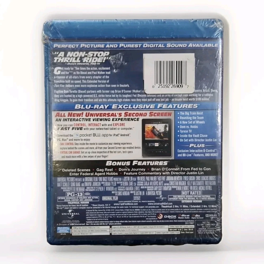 Rating: PG-13 Modified Item: No Language: English Studio: Universal Studios DVD Edition Year: 2013 Case Type: Blu-ray Case Genre: Thriller Leading Role: Vin Diesel/Paul Walker Edition: Extended Edition Movie/TV Title: Fast Five Director: Justin Lin Release Year: 2013 Region Code: Blu-ray: A (Americas, Southeast Asia...) Type: Movie Actor: Dwayne Johnson, Paul Walker, Vin Diesel Features: Extended Version gtin13: 0025192185632 Producer: Vin Diesel, Michael Fottrell, Neal H. Moritz UPC: 0025192185632 Format: Blu-ray Former Rental: No Country/Region of Manufacture: United States