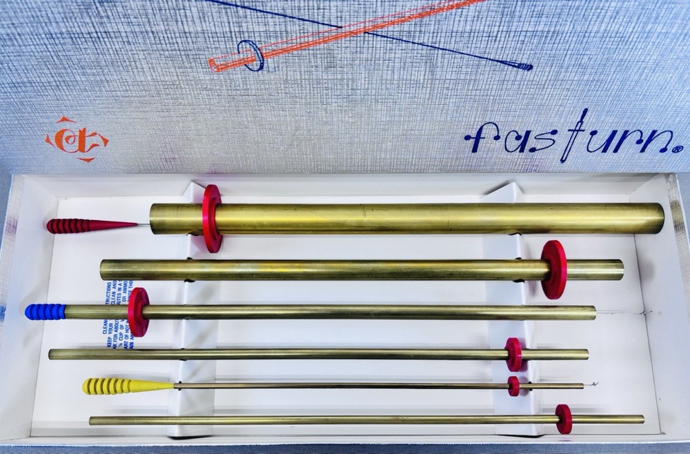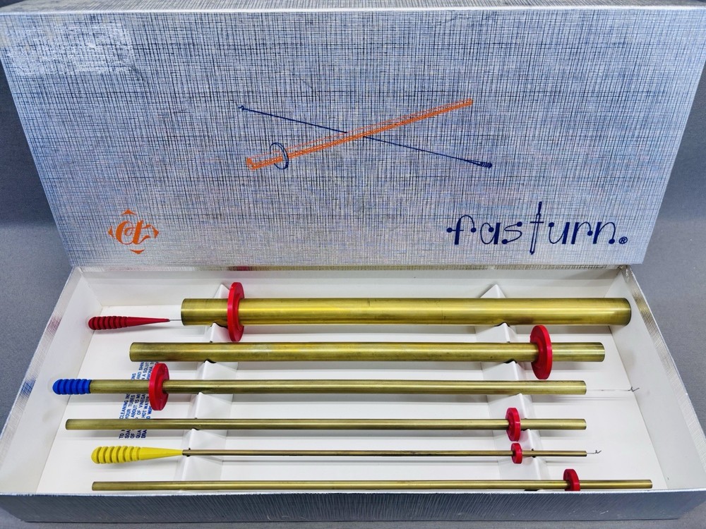 Fast Turn Fabric Tube Turning System Brass Tubes Hooks Original Box Instructions This Fast Turn fabric tube turning system includes brass tubes and hooks designed to make turning narrow fabric tubes fast and easy. Ideal for sewing, quilting, doll making, and other fabric crafts. The set appears to have seen little to no use and comes complete in the original box with original instructions. •Brand: Fast Turn •Includes: 6 brass tubes and 3 hooks (9 pieces total) •Material: Brass tubes with color coded handles •Function: Fabric tube and strap turning system •Condition: Very clean with minimal signs of use •Packaging: Original box included •Instructions: Original printed instructions included This is a well made vintage sewing tool set that is increasingly hard to find complete. Perfect for serious sewists, quilters, or collectors of quality sewing notions. Ships securely.