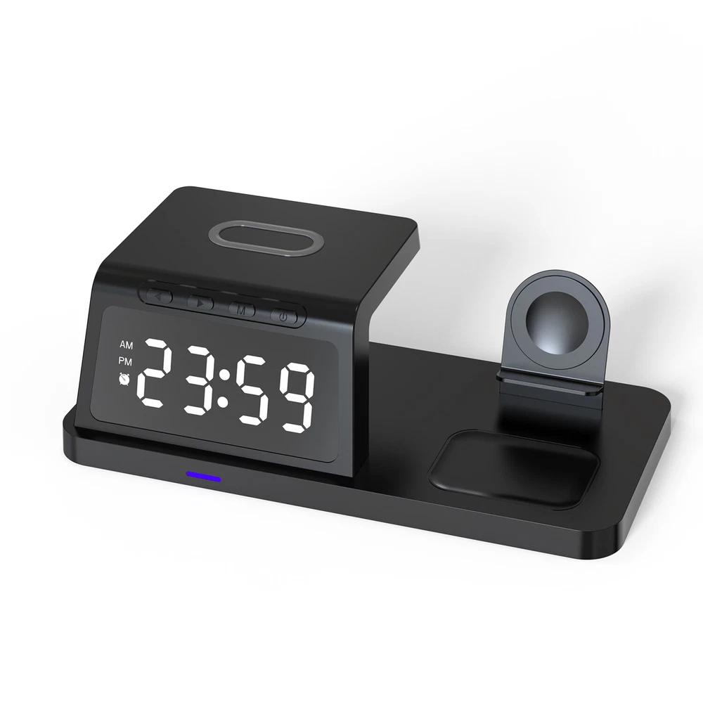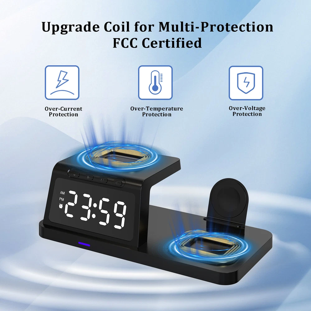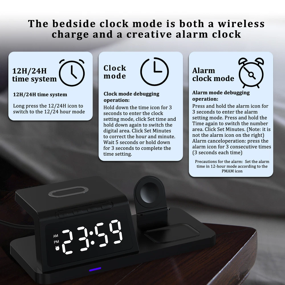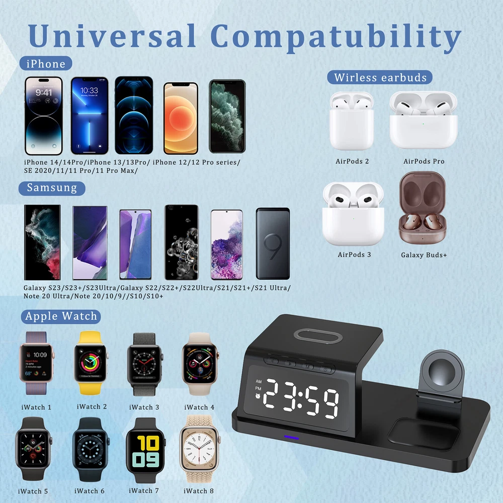 eBay Featu res : ● 4 in 1 Apple Wireless Charging Station: With the iphone wireless charger, you can charge your phone, apple watch and airpods at the same time. ● Fresh Digital Clock Design: No need to buy extra clock. The charger stand can be used as a clock for your bedside/office. iphone and apple watch charging station, 12/24 hour mode [alarm clock function] is provided. ● Display Night Light Adjustable Mode: Taking into account the difference in customer comfort preference, we have designed 5 modes of LED light level cycle. ● Charging Safety: The wireless charger uses advanced automatic control technology with built-in multiple protections for over temperature, short circuit, over charging, electromagnetic, over current, over voltage, etc. to ensure the safety of you and your device. ● Case Friendly: Our wireless charger is suitable for phone case which is within 6mm, But for more efficient charging, we still recommend you to remove the case before charging. (Metal attachments or credit cards will interfere with charging) ● Note: If you want to achieve maximum charging speed, please use cables and adapters compatible with QC (Quick Charge) 3.0 or PD (Power Delivery) Quick Charge. Descri ption : -- Material: ABS material -- Wireless charging standard: Qi -- Input interface: Type-C input -- Input: 5V/2A; 9V/2A; 12V/1.5A -- Mobile phone Output: 15W/ 10W/ 7.5W/ 5W -- Earphone Output: 5W -- Working frequency: 110-205KHz -- Charging efficiency: ≥75% -- Colour: Black / White Qi Wireless Charging Compatible phone Models: For Apple iphone 15 Pro Max/15 Pro/15 Plus/15/14 Pro Max/ 14 Pro/ 14 Plus/ 14/ 13 Pro Max/ 13 Pro/ 13/ 13 mini/ 12 Pro Max / 12 Pro / 12 mini / 12 / 11 Pro Max / 11 Pro / 11 / XS Max / XS / XR / X / 8 Plus / 8 / SE(2nd) For Samsung Galaxy S23 Ultra/ S23+ / S23 / S22 Ultra/ S22+ / S22 / S21 Ultra/ S21+ / S21 / S20 Ultra / S20+ / S20 / S10e / S10+ / S10 / S9+ / S9 / S8+ / S8 / S7 edge / S7/ S6 edge / S6 For Samsung Galaxy Note 20 Ultra / 20 / 10+ / 10 / 9 / 8 / 5 For Google Pixel 4 XL / Pixel 4 / Pixel 3 XL / Pixel 3 For Google Nexus 4/ 5/ 6/ 7 2nd Gen For Huawei Mate RS / Mate 20 Pro / Mate 30 / Mate 40 / Mate 30 Pro / Mate 40 Pro / Mate 40 RS/ P30 Pro / P40 Pro / P40 Pro+ For Xiaomi MIX 2S / MIX 3 / 9 / 9 Pro / 10 / 10 Pro/ 11 For LG G7 ThinQ / V30 / V30 Plus / V30s ThinQ / V35 ThinQ / V40 ThinQ / V50 ThinQ For Other QI Enabled Devices Wireless Charging compatible with : For Apple AirPods Pro / AirPods Pro2 / AirPods 3 / AirPods 2 For Samsung Galaxy Buds 2 / Galaxy Buds Pro / Galaxy Buds / Galaxy Buds+ / Galaxy Buds Live Wireless Charging compatible with : Only compatible with Apple Watch 8/7/6/SE/5/4/3/2 (please do not use a protective case with a thickness of more than 5mm). Package included: 1* Wireless Charger 1* Type-C Charging Cable 1* User Manual Note: Please verify that your phone has QI wireless charging function prior to purchase. If your phone does not have the QI wireless charging function (phones listed above), you will need a QI standard wireless charging receiver which is not provided. Your phone should be placed in the center of the charging pad. Otherwise, your phone will not charge efficiently. If you have a phone case it must be less than 6mm thick in order to charge your phone.