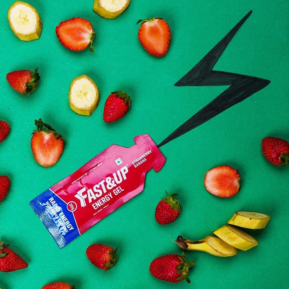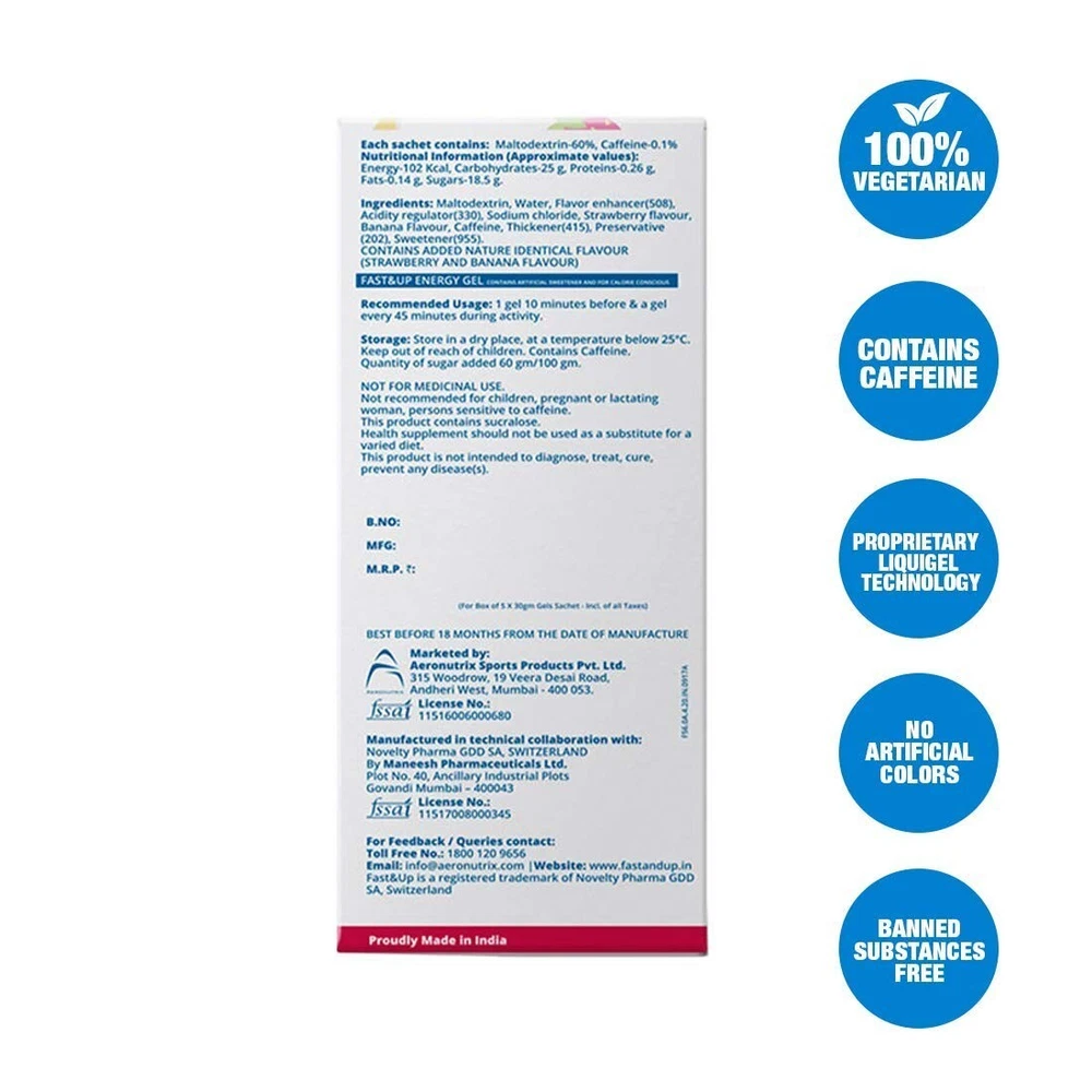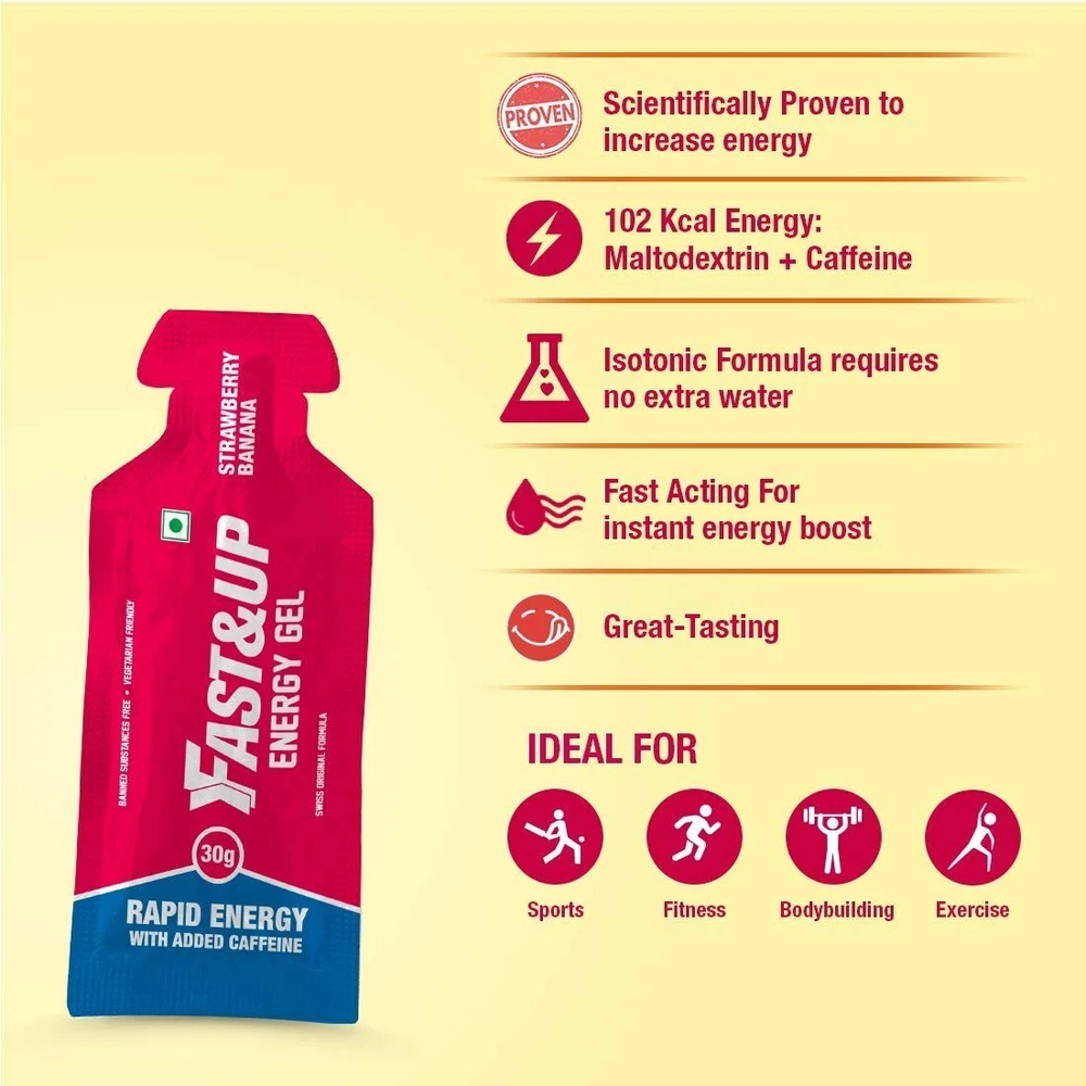 Ingredients: Maltodextrin, Caffeine Directions: Just BITE-SQUEEZE-ACTION for a bullet-busting performance. No water or any kind of preparation is required. Product description Fast&Up Energy Gel is a carbohydrate based energy gel formulated with a blend of 60 percent maltodextrin and 0.1 percent caffeine which is easy to open and sip during your game. Packed with 102 kcal of instant energy in a single serving gel sachet, Energy Gel provides instant energy boost with maltodextrin, a carbohydrate that's more quickly absorbed than other carbohydrates. This strawberry banana flavoured energy gel contains caffeine to keep you alert and improve your focus during your game. Formulated using proprietary technology, Fast&Up Energy Gel is easily absorbed and digested without any stomach upset. There is no need for any extra preparation of water, all you need to do is just bite, squeeze and sip. It is easy-to-carry, highly-effective and provides you with instant energy that digests easier than any other sports energy gel. The result is fast acting and long-lasting energy with peak performance without any gastrointestinal discomfort. This high performance energy gel with tasty flavour is a great choice if you want to enhance your endurance performance and prolong your energy levels. From the brand Previous page Next page From the manufacturer Fast&Up Energy gel provides instant energy for a prolonged workout session. This is due to presence of Maltodextrin and Caffeine- a unique combination formulated by Fast&Up in energy gel form with the help of Liquigel technology. Maltodextrin and caffeine provide instant energy during activities such as marathon runs etc. by enhancing glucose utilization by the body. The energy gel is banned substance free and easily absorbed by the body making energy release quicker. These energy gels can be consumed every 30-45 minutes during workouts by just Bite-Squeeze action as they are available in portable sachets for energy recovery. Fast&Up Energy gel boosts energy for running, cycling, to avoid energy depletion before reaching the finish line. Consuming energy gel prevents bloating as it doesn’t require water. It gives energy within 7-10 minutes of its use. Fast&Up Energy gel helps to bring out the best in your performance without getting exhausted. Available in pack of 5 gel sachets in Strawberry Banana as well as Chocolate flavour Benefits Instant Energy Boost Formulated with Carbohydrate like Maltodextrin and Caffeine, Fast&Up Energy Gel provides Instant Energy to boost performance Caffeine Boost Added Caffeine helps improve focus, alertness and endurance Ready to Consume No need for any mixing or any extra preparation with water, just Bite, Squeeze and Go Easy to Carry Available in easy to carry sachets, Fast&Up Energy Gels can even fit your pocket for instant energy on the go About Fast&Up Fast&Up is an Indian Sports and Active Nutrition brand with Innovative Technology. Nutrition Supplements scientifically crafted with Swiss Formula helps to boost your performance as well as maintain a healthy lifestyle. Available in a variety of flavours and more servings our sports nutrition supplements compact a perfect blend of high-quality Amino Acids and Vitamins that promote faster muscle recovery and overall performance boost. Powered by Innovative Effervescent Technology, Fast&Up nutrition supplements helps to maintain a healthy and Active lifestyle for daily performance enhancement. Fast&Up products are formulated with the sheer motive of fuelling the fitness essentials of the nation such as hydration, Active Nutrition, Performance boost etc.