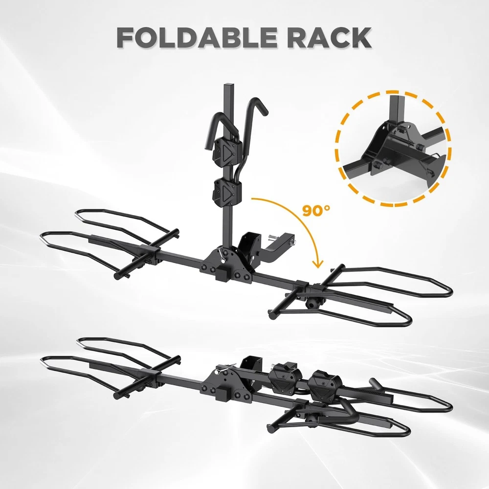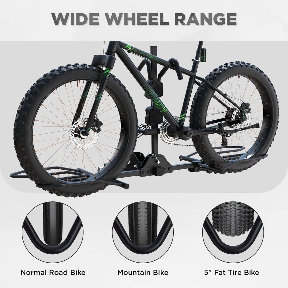 Bike Racks for Ebikes,Fat Tire Bike Rack for Tow Hitch 2-Bike 160 lbs Capacity,Hitch Bike Rack for Heavy E Bike, Wobble Free Smart Tilting Folding Bicycle Car Racks for Standard, 2 inch Receiver Item Description About this item 🚲【Solid & Stable】TANX hitch bike rack is refined from high-strength alloy steel with 160 lbs authentic load capacity,66 lbs for each bike. Suitable for maximum tire width up to 5", Designed for loading with all kinds of bicycles, such as normal road bikes, mountain bikes,fat tires bikes and e-bike. 🚲【Lockable Padded Soft Clamps 】This hitch bike rack provides more safety and stability without scratching your bicycle paint surface. And the locking system ensures that your bicycle will not detach from the hook due to bumps while driving. 🚲【Avilable for Folding & Tilting】Our mounted bike rack can be folded up against your vehicle or truck when not in use for space-saving, and tiltable design make it possible for you to access the trunk without removing the bike rack. 🚲【Adjustable Wheel Holders】4 wheel holders can be slided left and right to accommodate the length of wheelbase up to 59", suitable for various bicycles with different wheelbase lengths, specially for cycling enthusiasts. 🚲【 Clear Installation Process】Our hitch bike rack is easy to install that you could follow the steps of instruction manual attached in package or watch the install video on our details page, and the most important thing is that you can find all the necessary tools for installation inside the packaging without extra preparation.